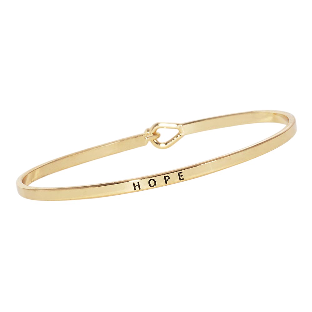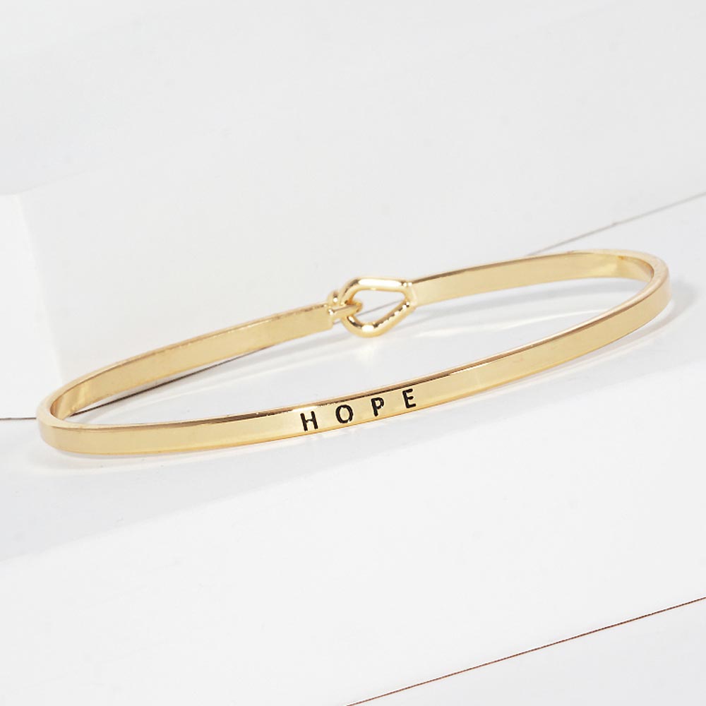 Details • Size : 0.2" H, 2.5" D • Hook Closure • This delicate bangle bracelet features a slender band engraved with the uplifting word “Hope.” Finished with a heart-shaped hook clasp, it’s a timeless accessory that serves as a daily reminder of resilience and optimism. Perfect for gifting or wearing with meaningful intent. • Lead and Nickel Compliant • Brass