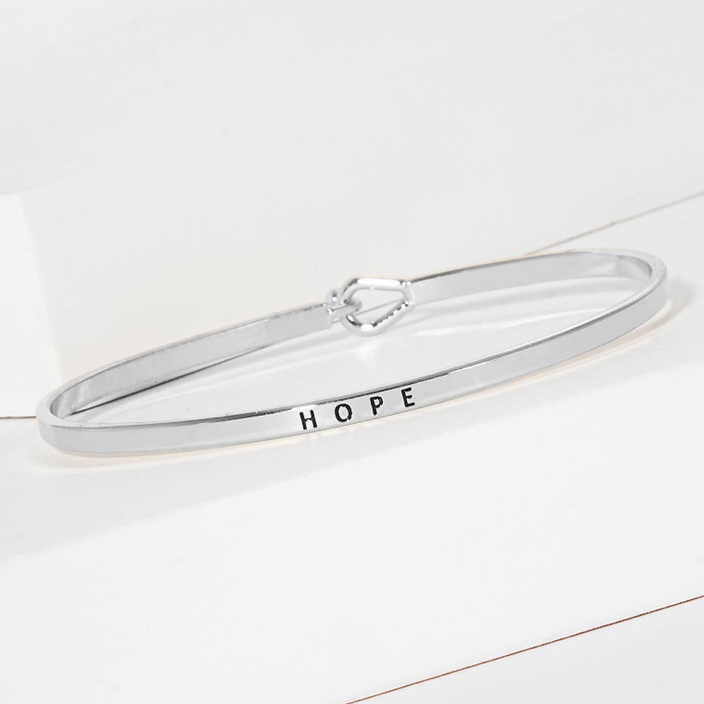 Details • Size : 0.2" H, 2.5" D • Hook Closure • This delicate bangle bracelet features a slender band engraved with the uplifting word “Hope.” Finished with a heart-shaped hook clasp, it’s a timeless accessory that serves as a daily reminder of resilience and optimism. Perfect for gifting or wearing with meaningful intent. • Lead and Nickel Compliant • Brass
