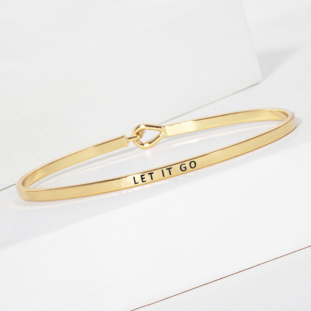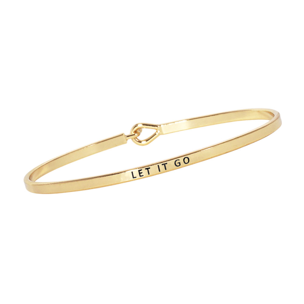 Details • Size : 0.2" H, 2.5" D • Hook Closure • Stay inspired with this minimalist bangle bracelet engraved with the motivational phrase “Let It Go.” Featuring a sleek and modern design, it’s perfect for daily wear or gifting. The secure hook closure ensures a comfortable fit while delivering a powerful reminder. • Brass • Lead and Nickel Compliant