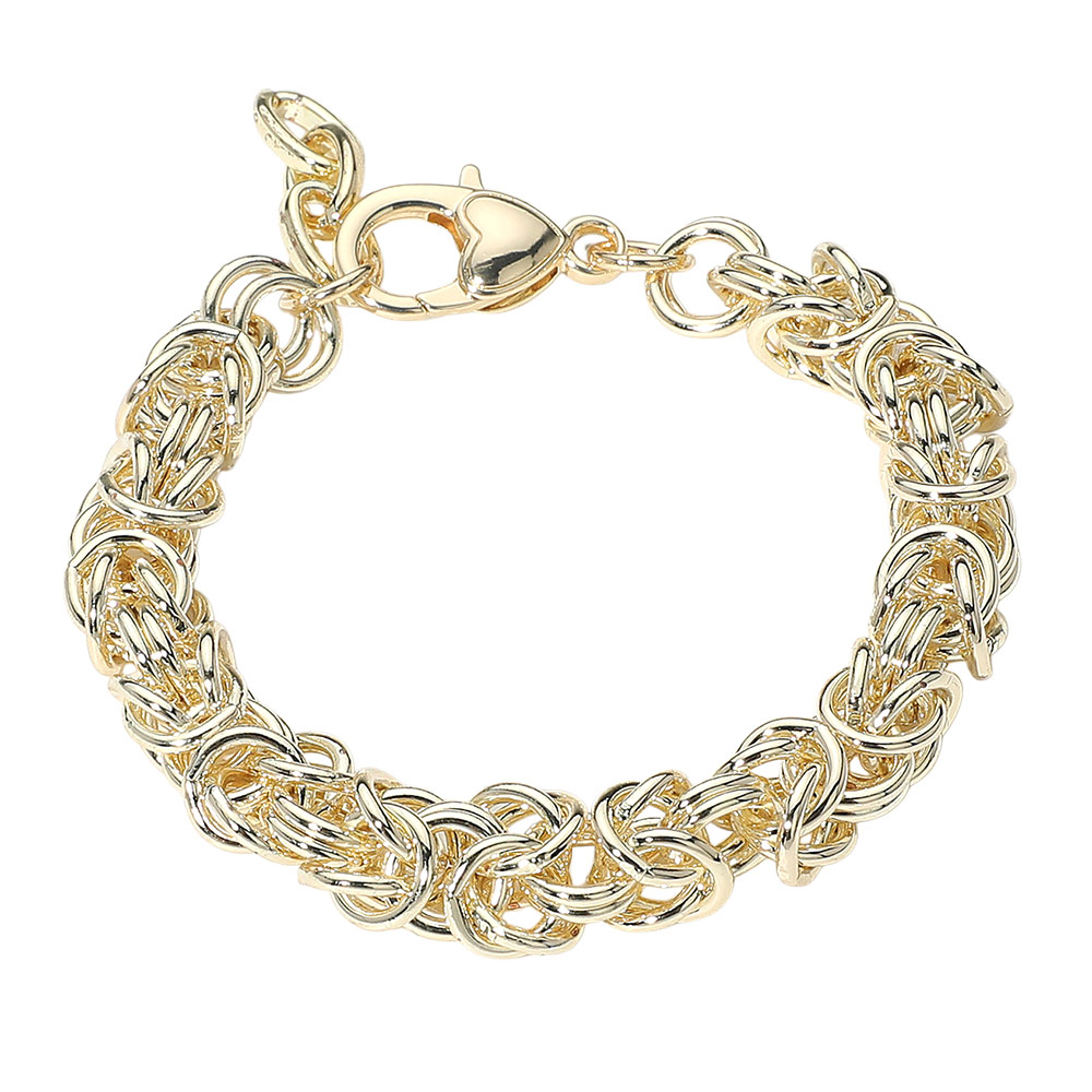Details • Size : 0.4" H, 7.5" + 1" L • Lobster Clasp Closure • Elegant bracelet featuring intricately woven knot links and a heart-shaped clasp. A statement accessory with a unique, textured design that adds charm and sophistication to both casual and formal outfits. • Gold Dipped