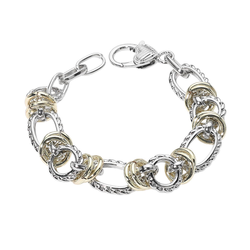 Details • Size : 0.6" H, 7.5" + 1" L • Lobster Clasp Closure • Bold bracelet with interlocking textured and smooth circles in varied finishes. A statement piece that adds dynamic flair to any outfit, secured with a sturdy toggle clasp for easy wear. • Gold Dipped