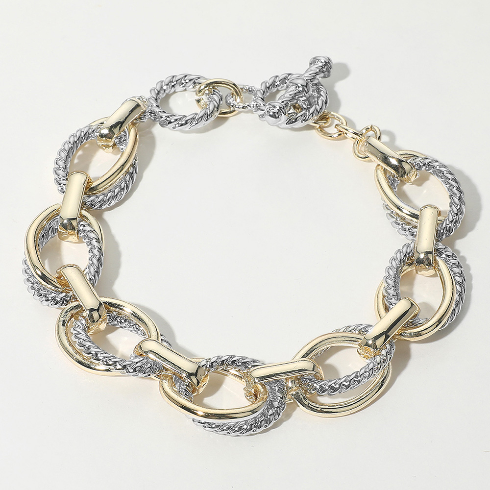 Details • Size : 0.7" H, 8" + 1.5" L • Toggle Closure • Bold link chain bracelet featuring interlocking textured and smooth oval links with a secure toggle clasp. A modern and versatile accessory that adds a statement touch to both casual and formal outfits. Perfect for layering or wearing solo. • Gold Dipped