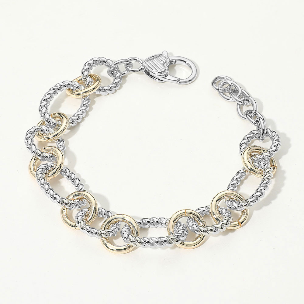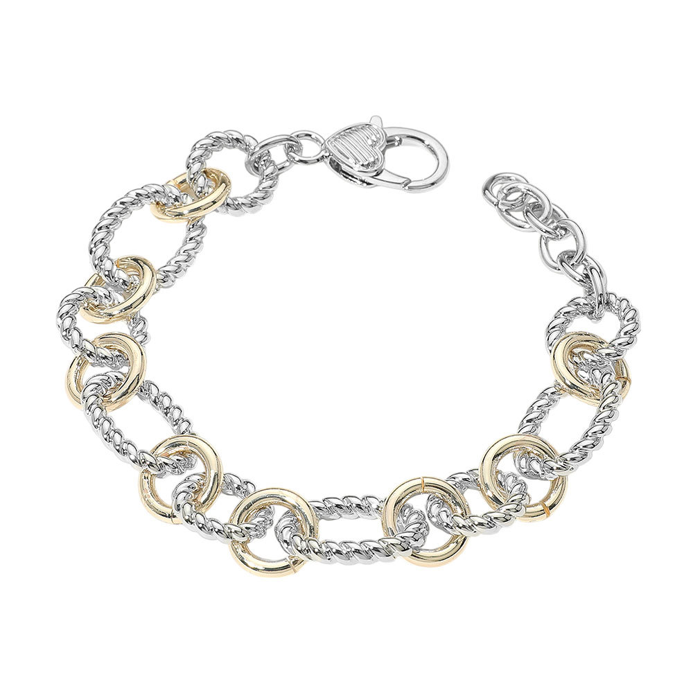 Details • Size : 0.7" H, 8" + 1.25" L • Lobster Clasp Closure • Stylish bracelet featuring a blend of smooth and textured circular links in a dual-tone finish. The design offers a bold yet elegant look, secured with a sturdy clasp for everyday or statement wear. • Gold Dipped
