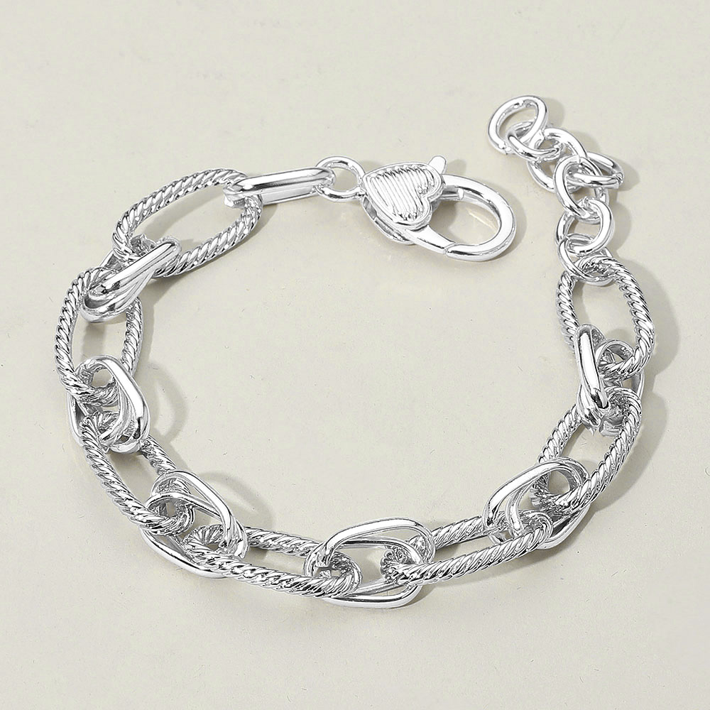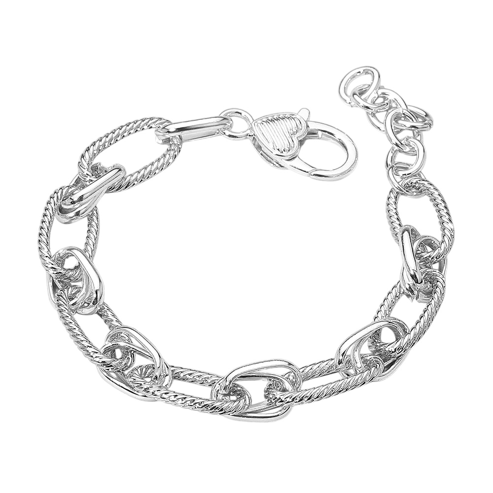 Details • Size : 0.4" H, 8.25" + 1.75" L • Lobster Clasp Closure • Elevate your accessory collection with this two-tone link chain bracelet, featuring a stylish mix of textured and smooth links and a charming heart-shaped clasp for a touch of elegance. • Gold Dipped