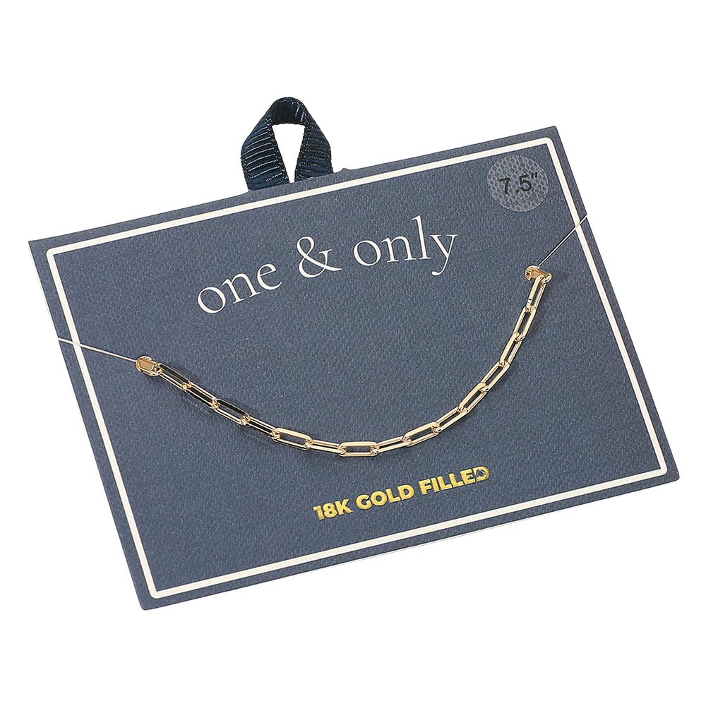 Details • Size : 0.1" H (3mm), 7.5" L • Elegant chain bracelet featuring a minimalist link design for timeless sophistication. Lightweight and versatile, it’s perfect for layering or wearing alone. Presented on a “one & only” card for effortless gifting and everyday elegance. • Lead and Nickel Compliant • Gold Filled • Made In Brazil