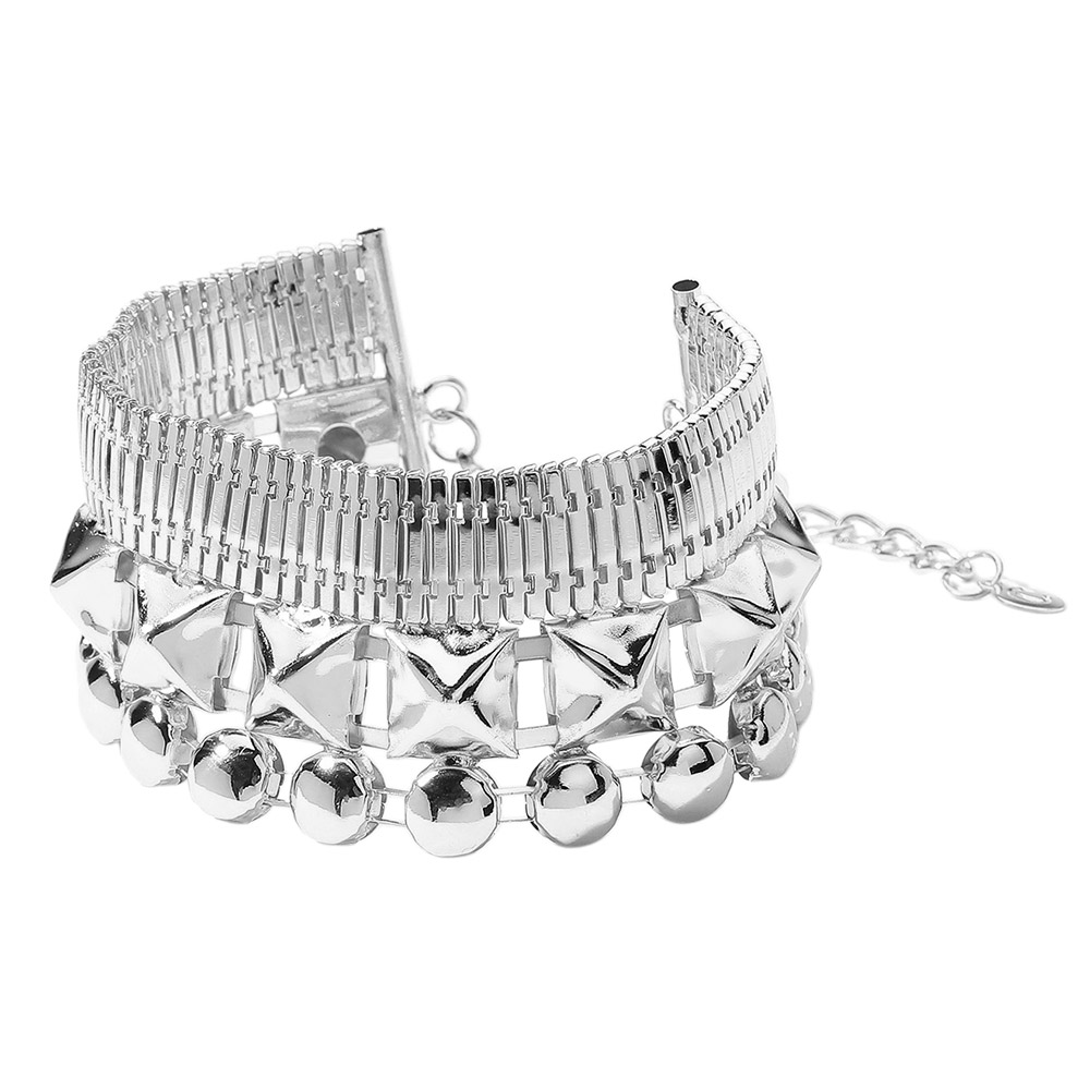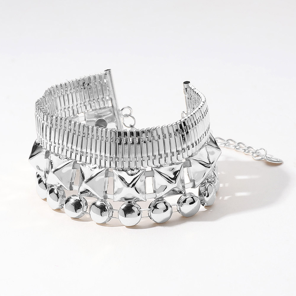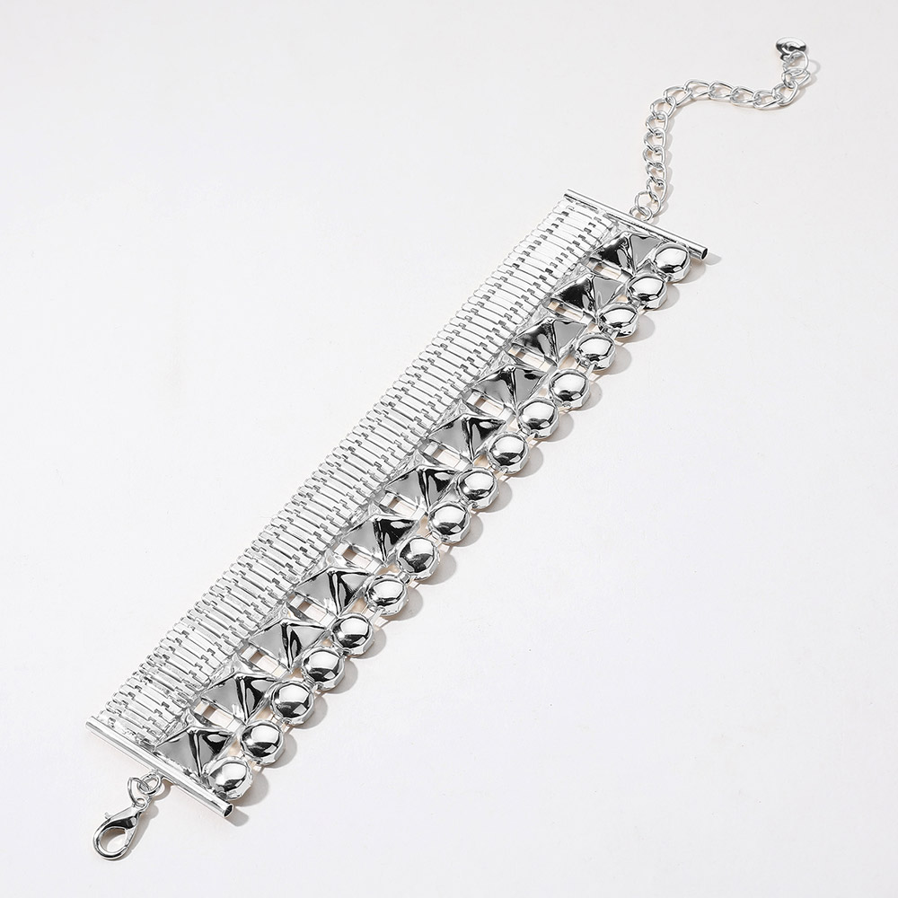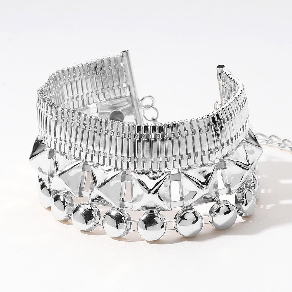 Details • Size : 1.4" H, 7" + 3" L • Lobster Clasp Closure • Elevate your look with this bold layered bracelet featuring sleek bars, pyramid studs, and round bead accents. Designed to add an edgy yet polished touch to your outfit. Adjustable fit ensures comfort and versatility for any occasion. • Lead and Nickel Compliant