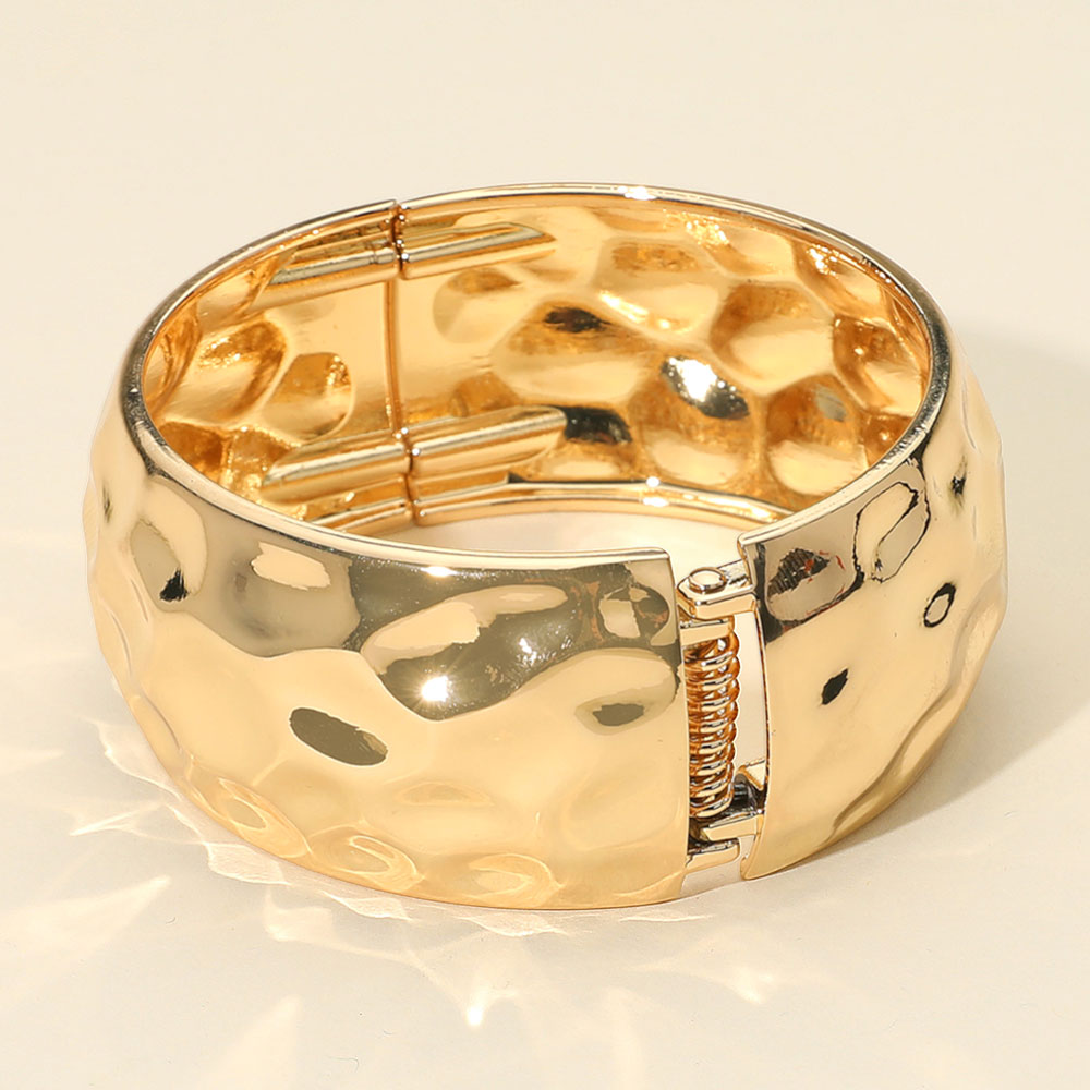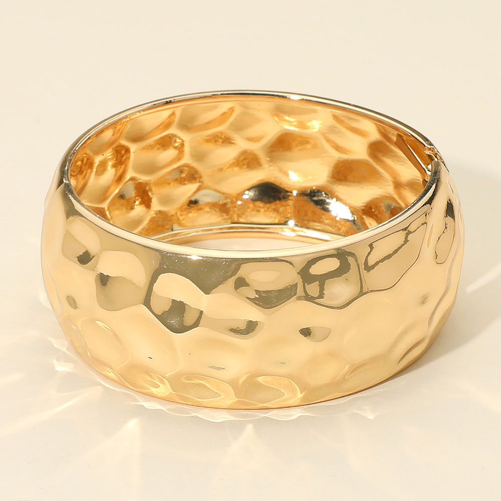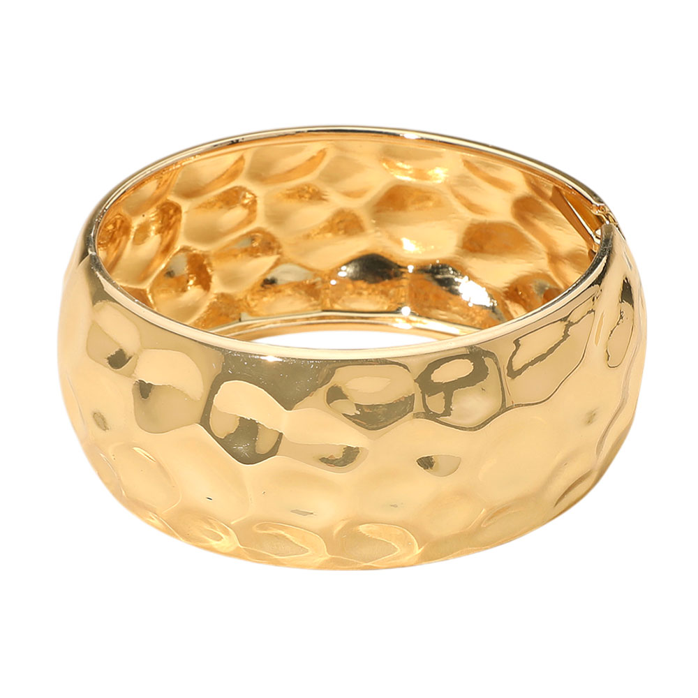 Details • Size : 1.2" H, 2.4" D • Hinged Closure • Make a statement with this bold hammered cuff bracelet, designed with a wide silhouette and gleaming finish. A versatile accessory that brings texture and elegance to both day and night outfits. • Lead and Nickel Compliant
