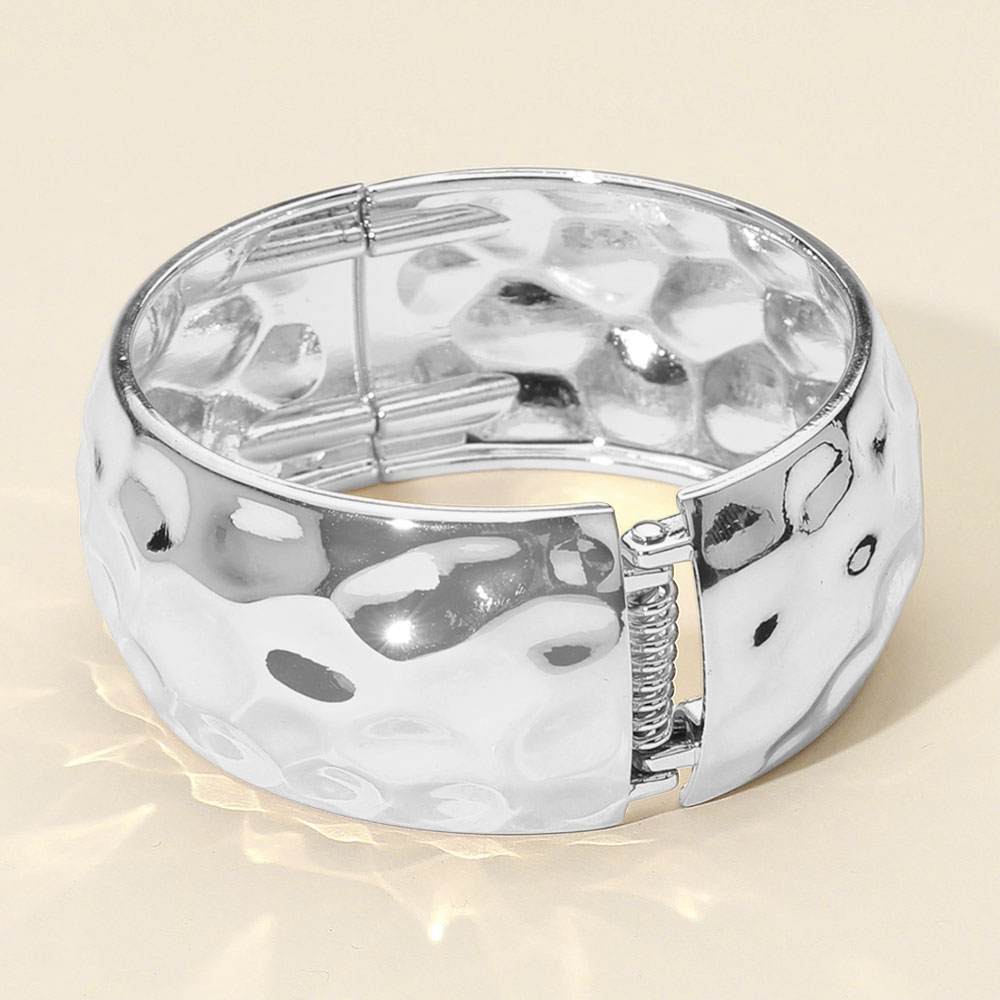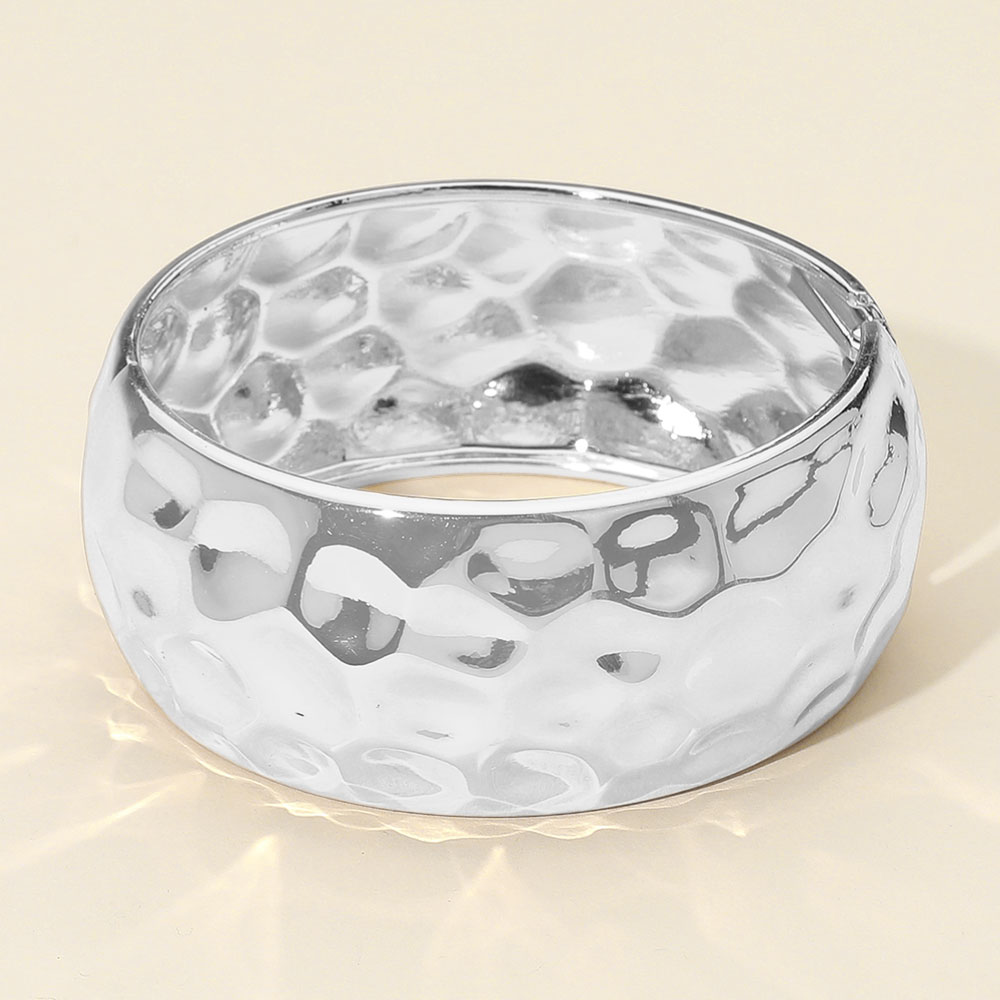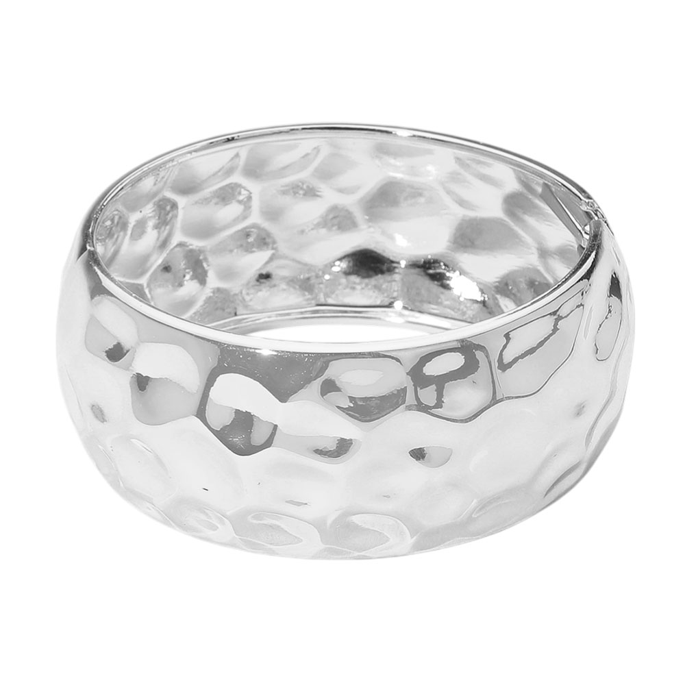 Details • Size : 1.2" H, 2.4" D • Hinged Closure • Make a statement with this bold hammered cuff bracelet, designed with a wide silhouette and gleaming finish. A versatile accessory that brings texture and elegance to both day and night outfits. • Lead and Nickel Compliant