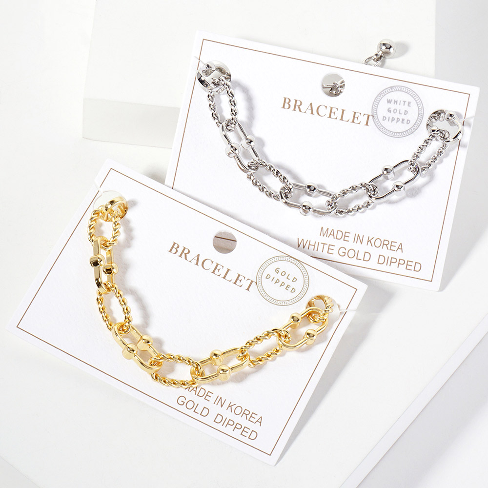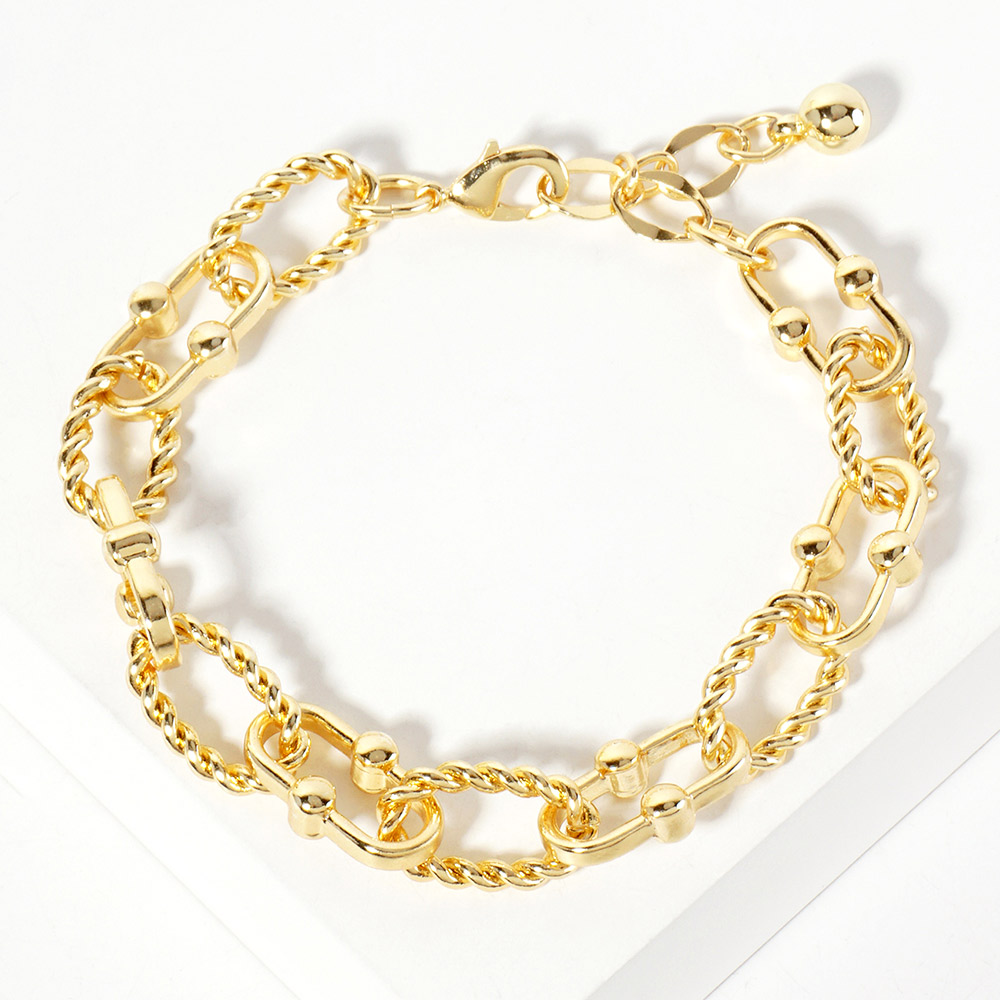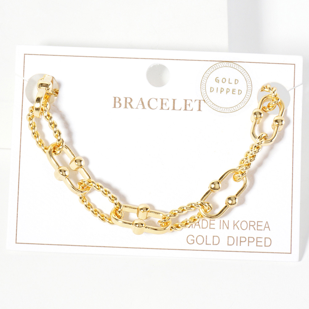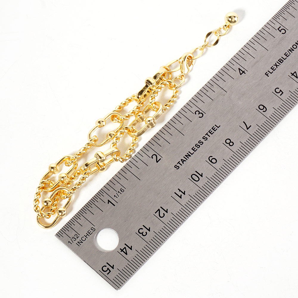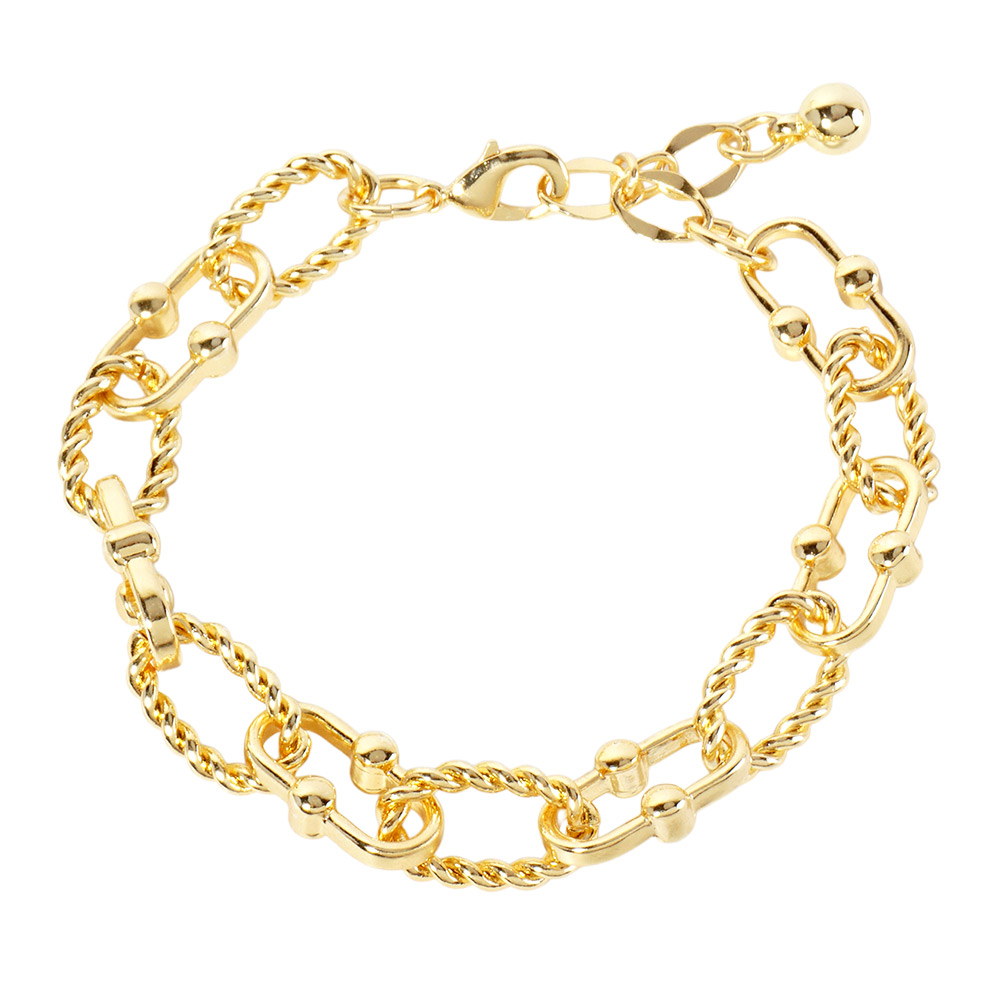 Details • Size : 0.4" H, 6.5" + 1.5" L • Lobster Clasp Closure • Elevate your everyday look with this twisted rope chain bracelet featuring interlocking links and elegant beaded accents. Its modern design blends texture and detail, making it a standout accessory for casual or dressy outfits while maintaining a timeless appeal. • Lead and Nickel Compliant • Made In Korea • Gold Dipped