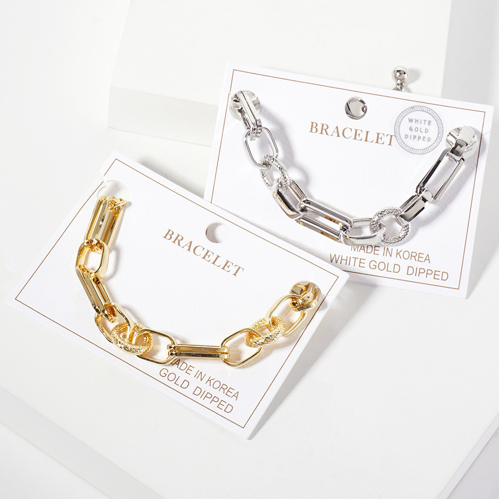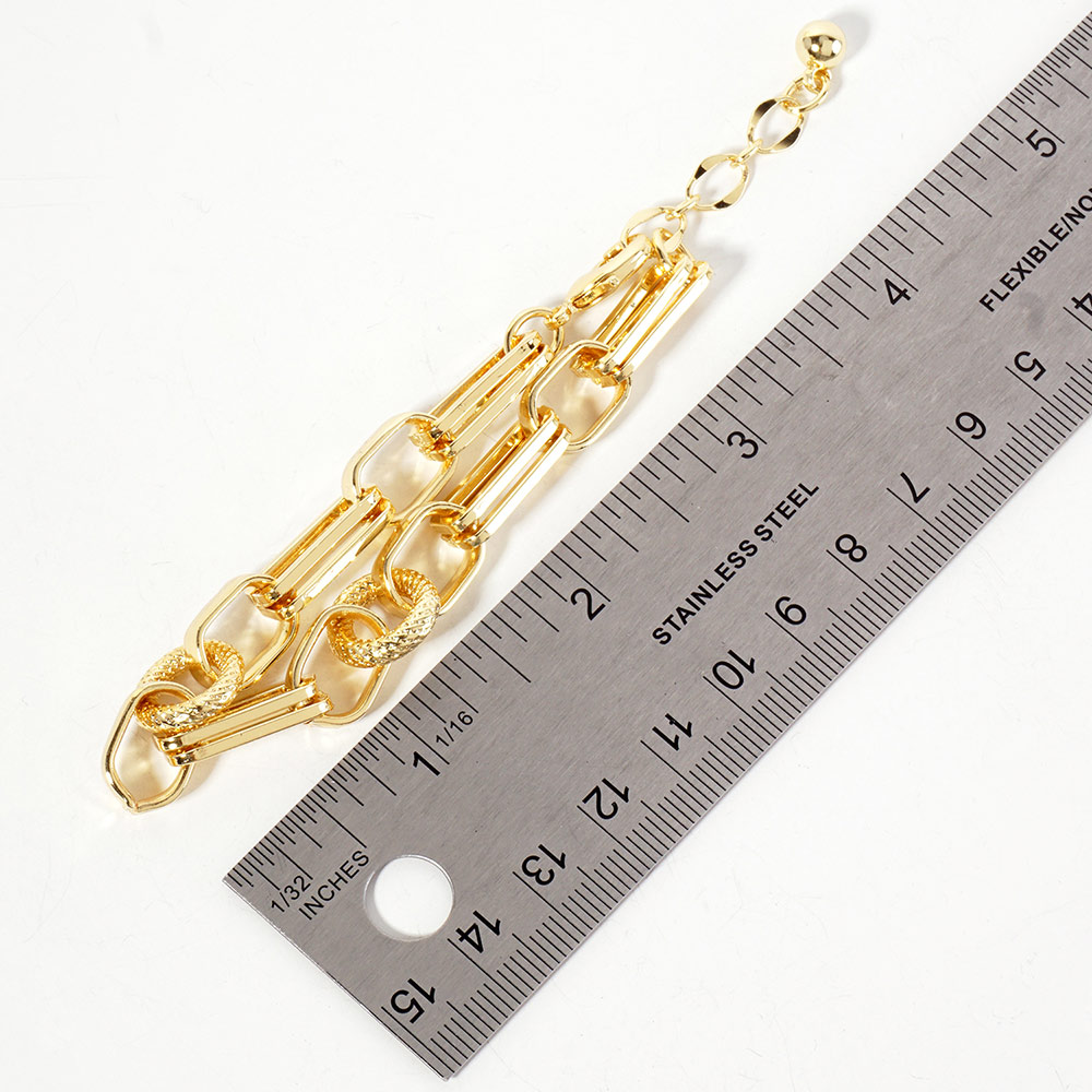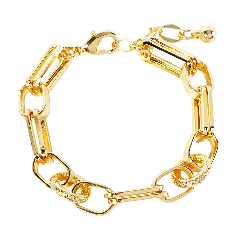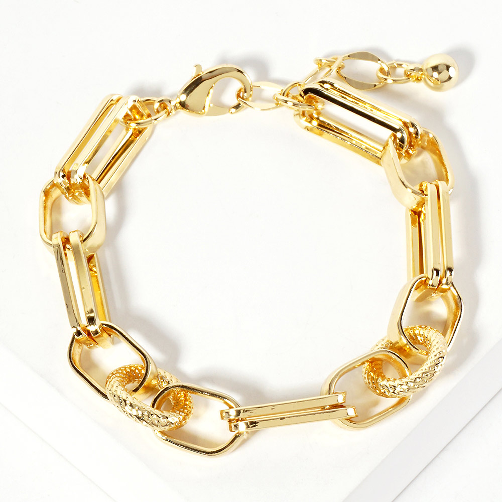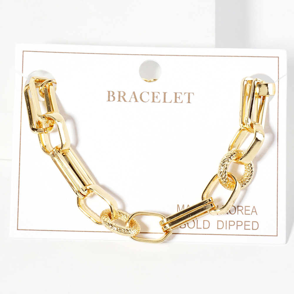 Details • Size : 0.4" H, 6.5" + 1.5" L • Lobster Clasp Closure • Elevate your style with this modern rectangular link bracelet featuring alternating smooth and textured finishes. The bold geometric design offers a chic, sophisticated look that pairs effortlessly with both casual and formal outfits. Includes an adjustable clasp for comfort. • Lead and Nickel Compliant • Made In Korea • Gold Dipped