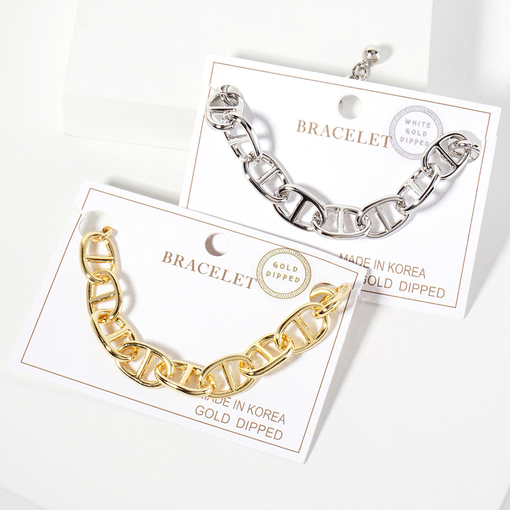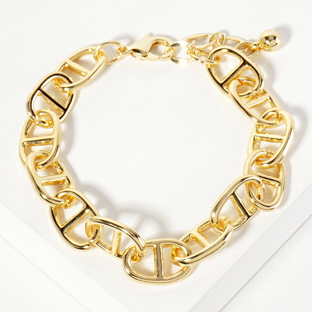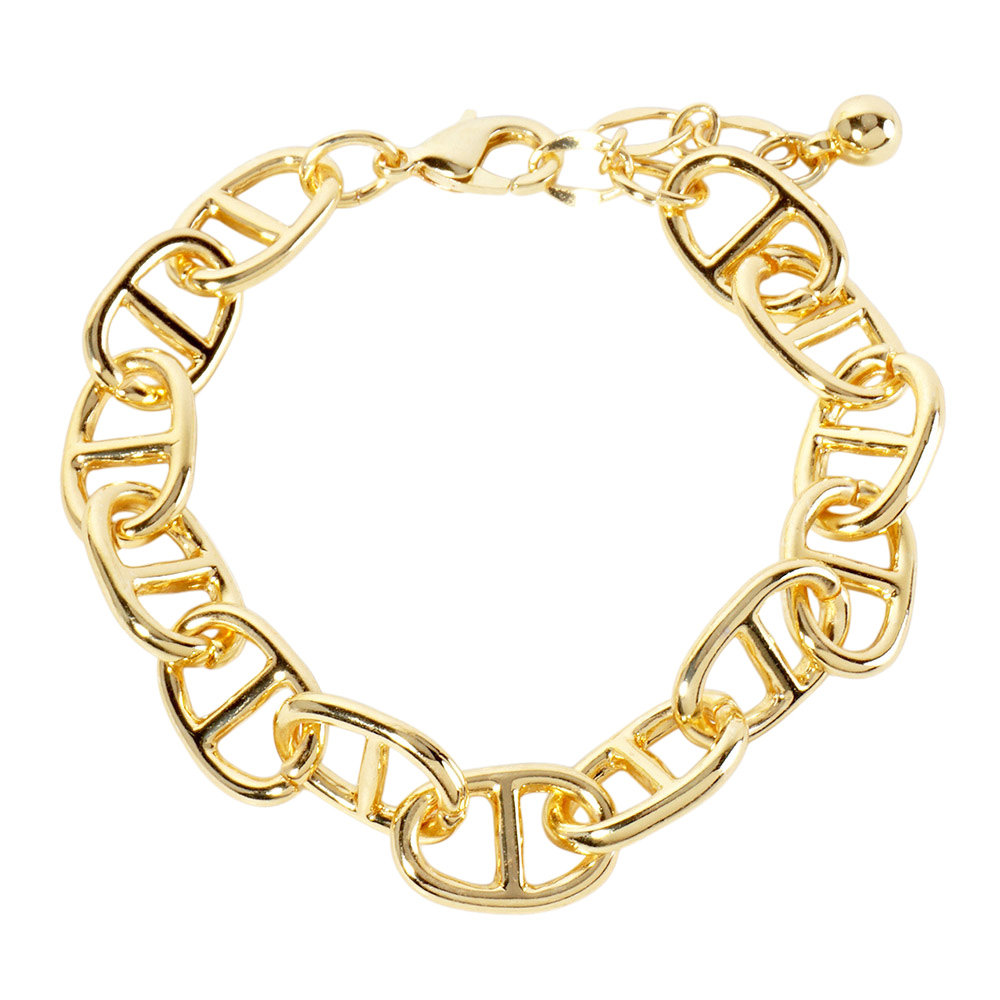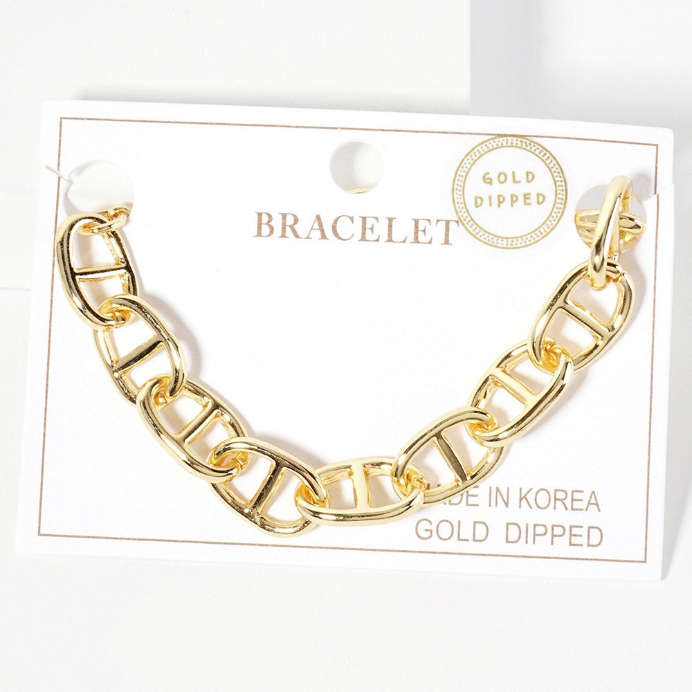 Details • Size : 0.4" H, 6.5" + 1.5" L • Lobster Clasp Closure • Elevate your style with this bold chain link bracelet featuring oversized links and a sleek polished finish. Perfect for layering or wearing solo, this versatile bracelet adds modern edge and sophistication to both casual and dressy outfits. • Lead and Nickel Compliant • Made In Korea • Gold Dipped