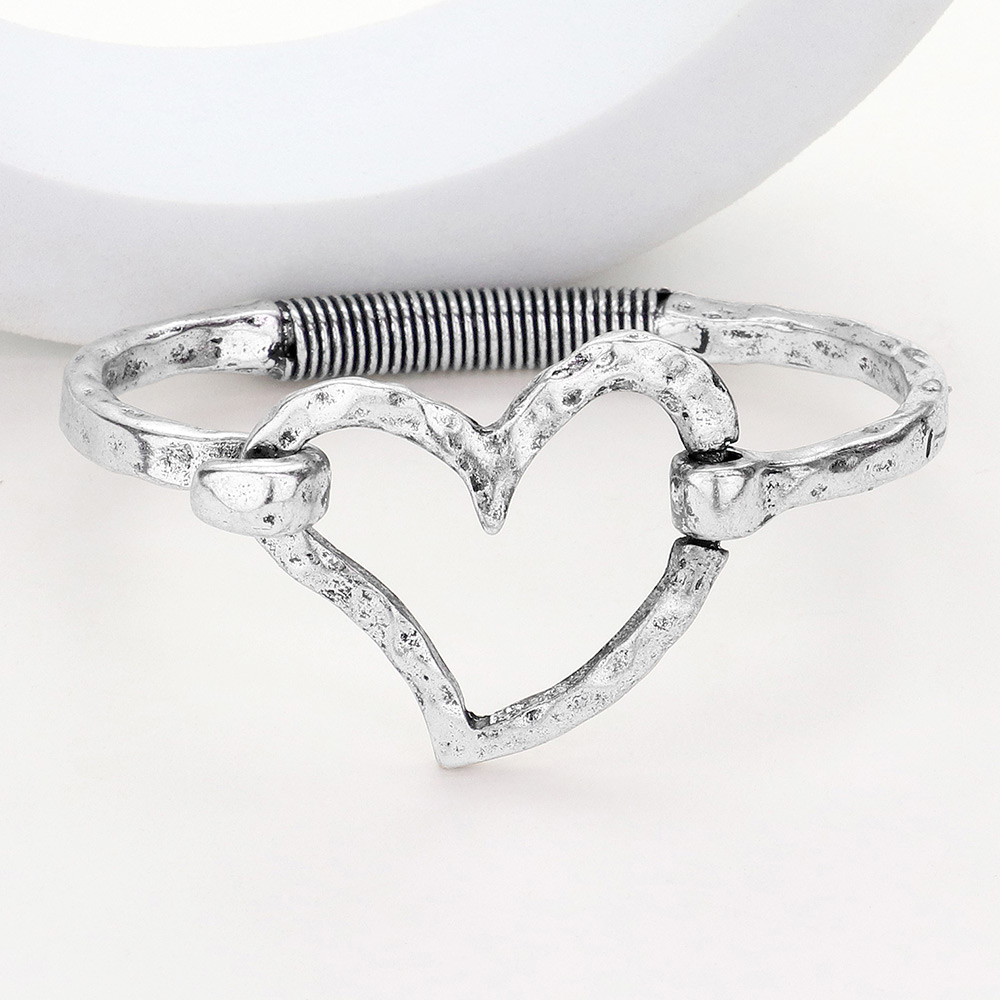 Details • Size : 1.5" H, 2.3" D • Hook Closure • This romantic cuff bracelet features a hand-textured finish and a beautifully sculpted open heart centerpiece. Designed with a flexible coil closure for easy wear, it brings charm and elegance to any outfit, making it a meaningful accessory for everyday style. • Lead and Nickel Compliant