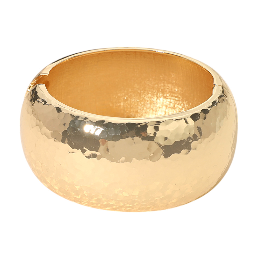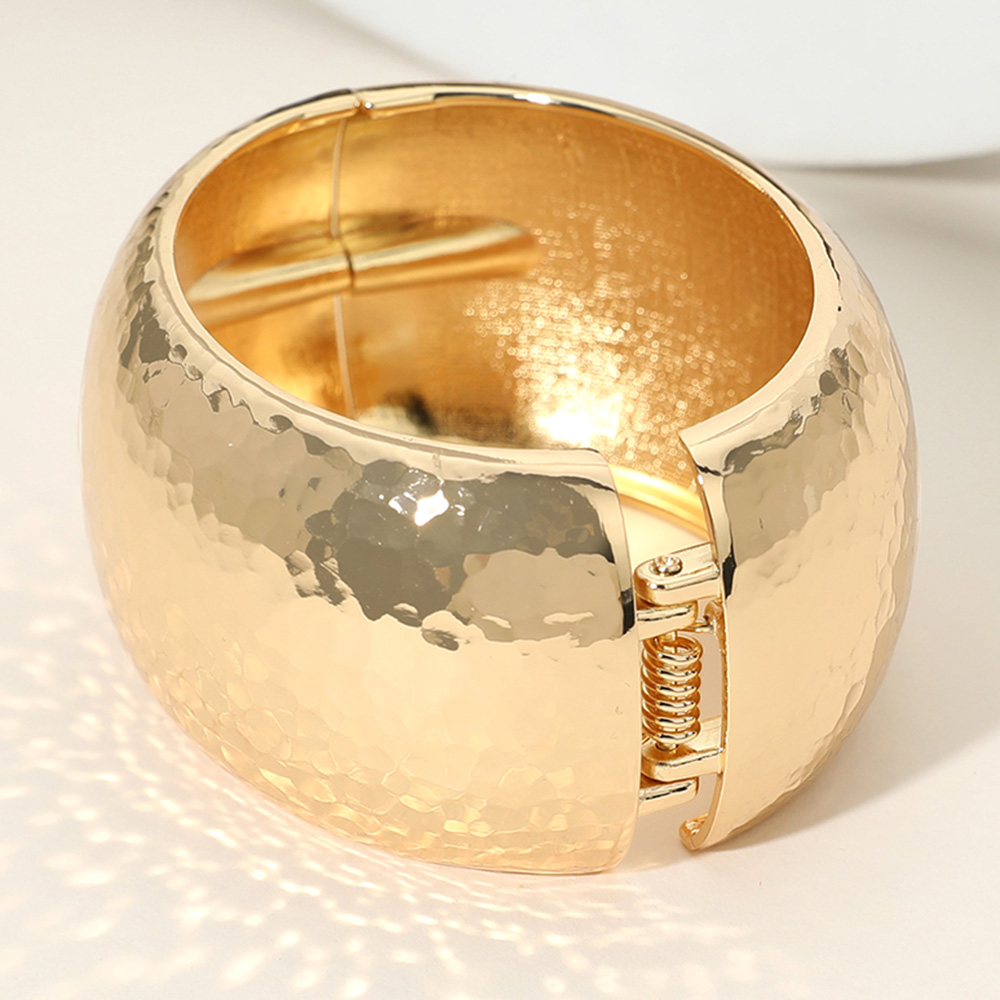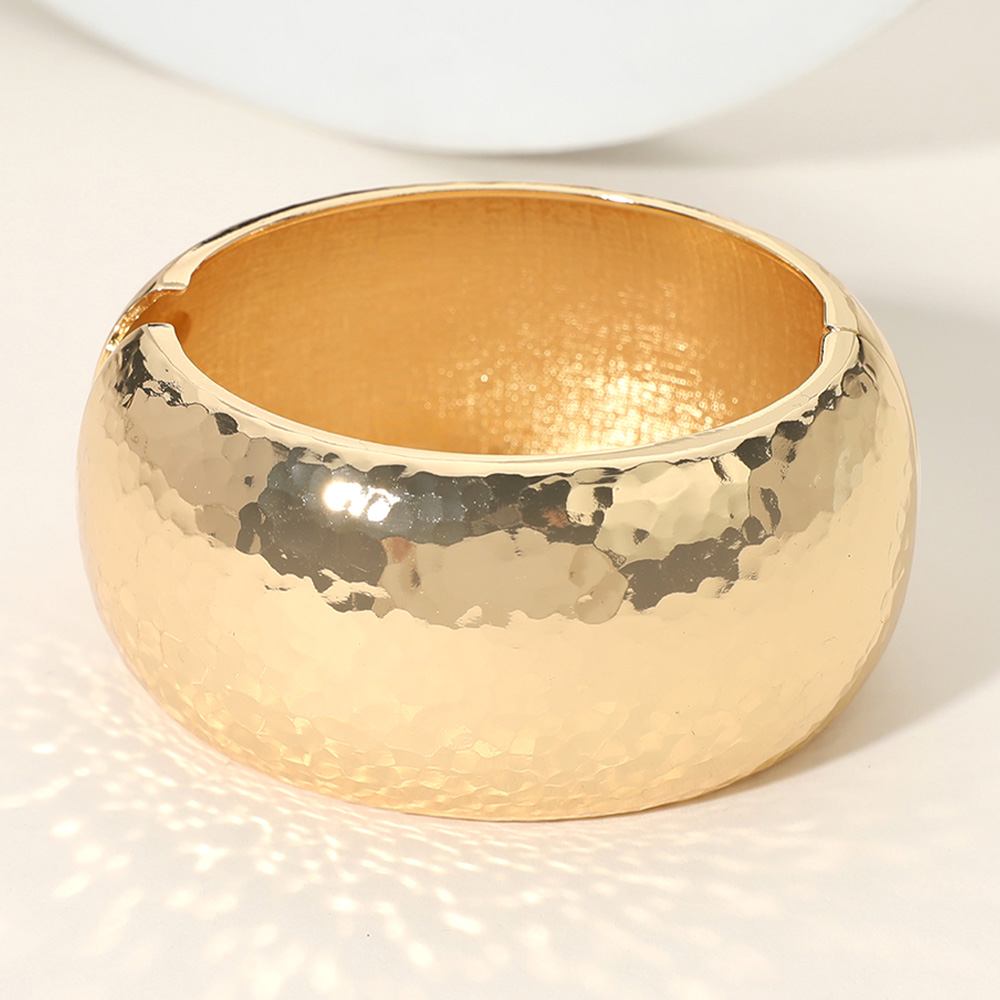 Details • Size : 1.5" H, 2.4" D • Hinged Closure • Elevate your style with this wide hammered bangle bracelet featuring a distinctive textured surface and bold silhouette. Designed to catch the light with every movement, this statement piece adds dimensional flair to both casual and dressy ensembles. • Lead and Nickel Compliant