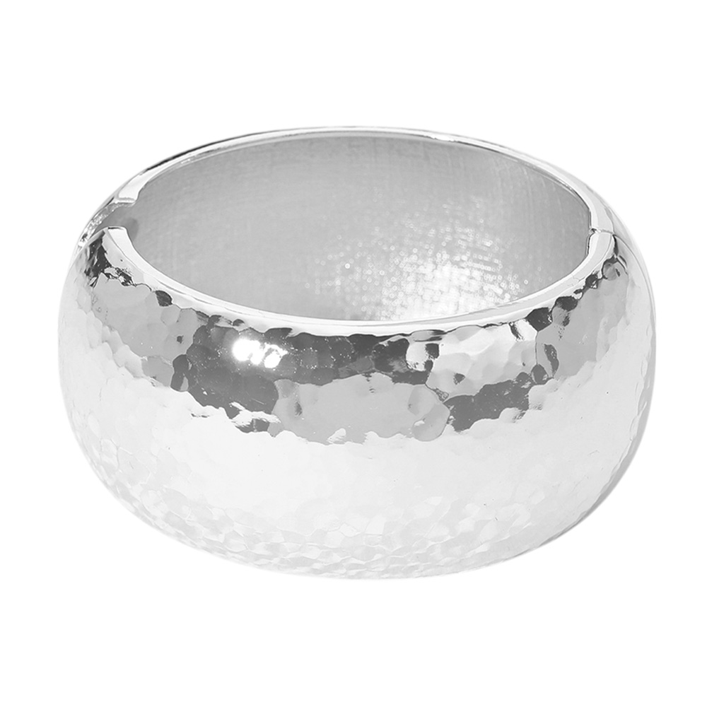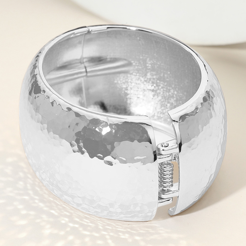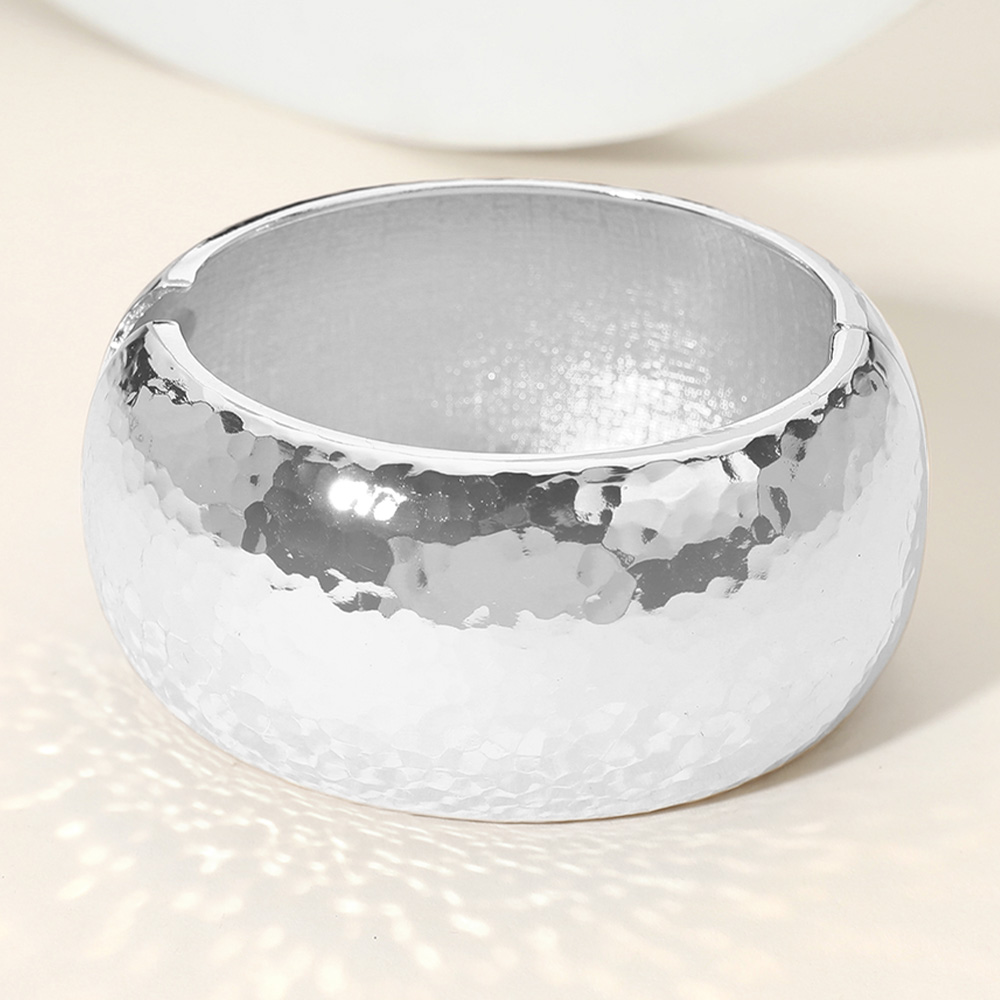 Details • Size : 1.5" H, 2.4" D • Hinged Closure • Elevate your style with this wide hammered bangle bracelet featuring a distinctive textured surface and bold silhouette. Designed to catch the light with every movement, this statement piece adds dimensional flair to both casual and dressy ensembles. • Lead and Nickel Compliant