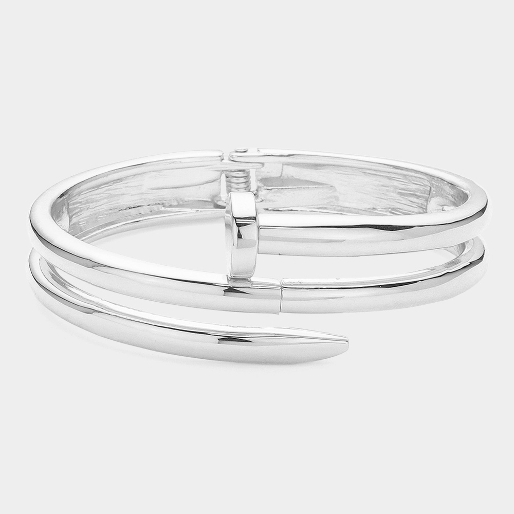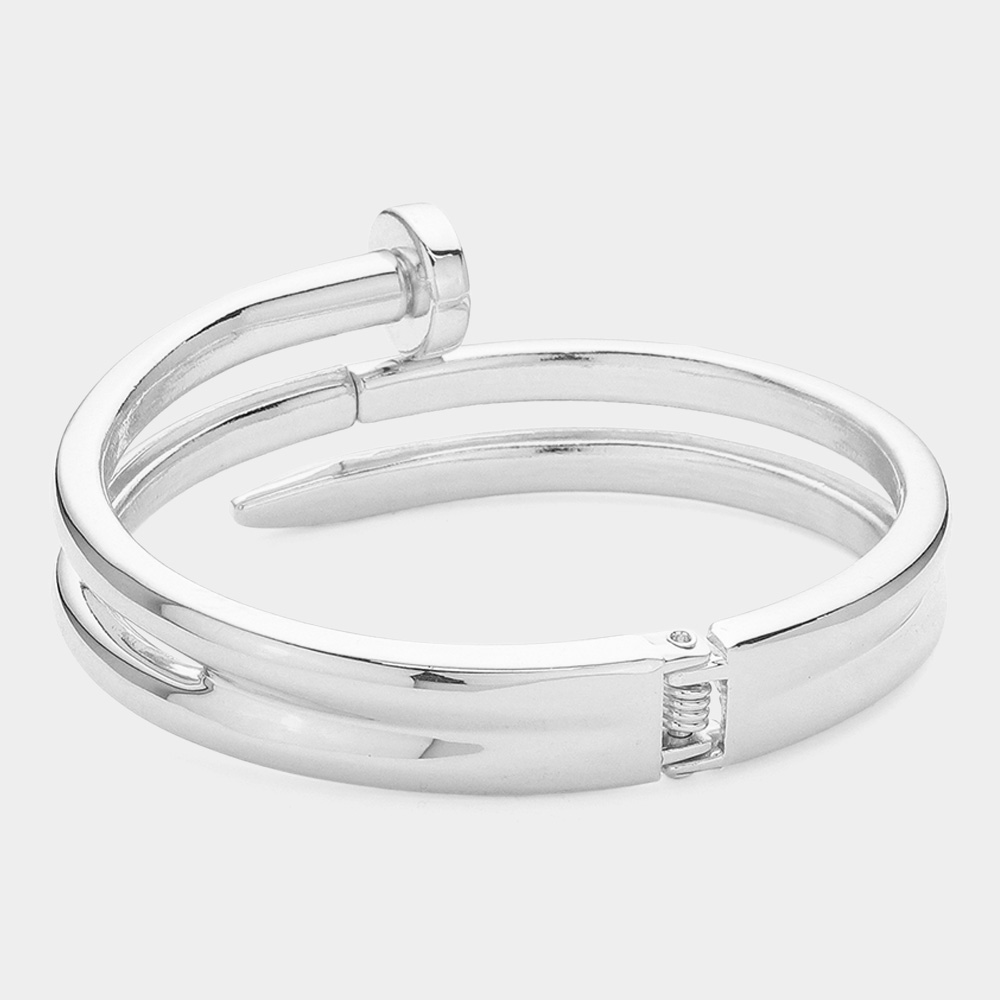 Details • Size : 1" H, 2.5" D • Hinged Closure • Contemporary double coil nail head bangle bracelet crafted with sleek curves for a bold, modern aesthetic. This stylish bracelet wraps elegantly around the wrist, offering a chic statement piece perfect for both casual and formal looks. A unique design that adds edge and sophistication to any outfit. • Lead and Nickel Compliant