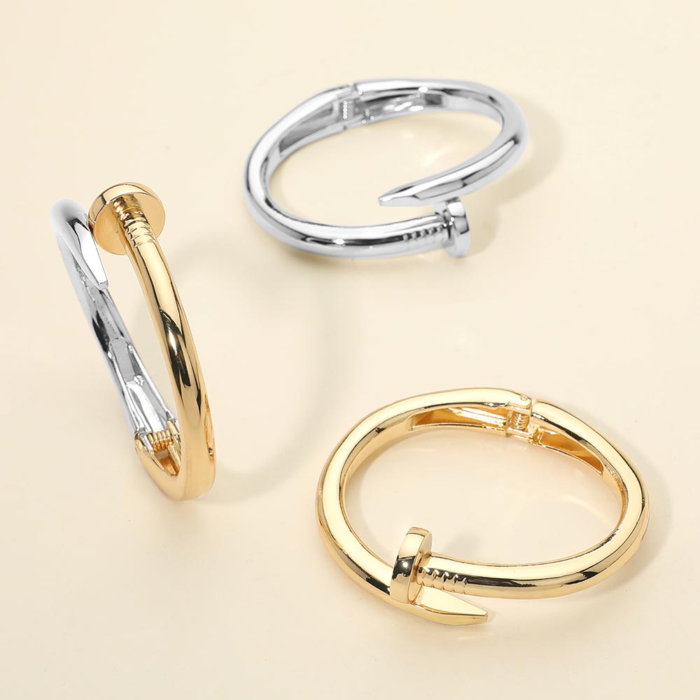 Details • Size : 0.8" H, 2.4" D • Hinged Closure • Statement nail inspired bracelet featuring a sleek open hinge design with sculptural curves. Modern and fashion forward, this bracelet adds an edgy yet refined accent to everyday outfits, workwear styling, and trend driven accessory collections. • Lead and Nickel Compliant