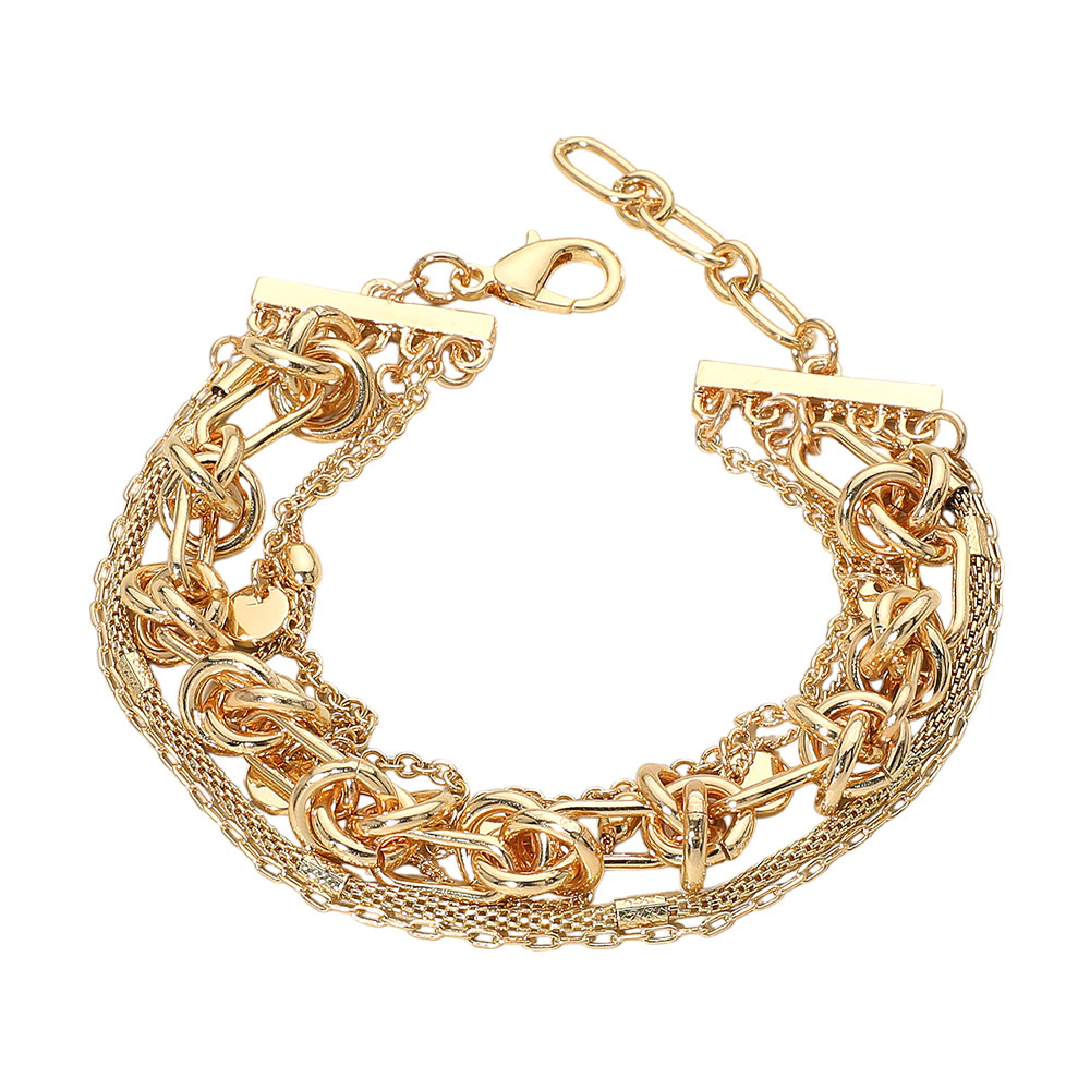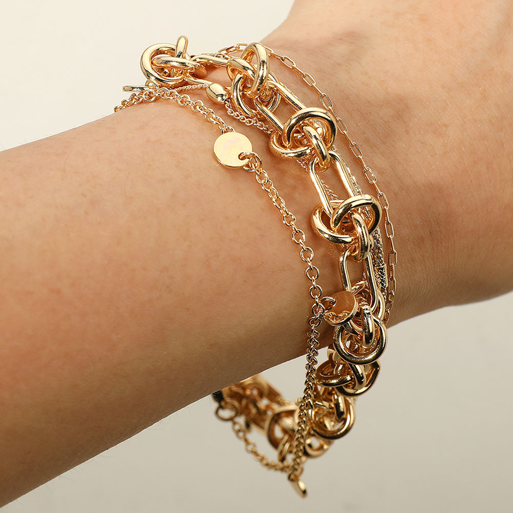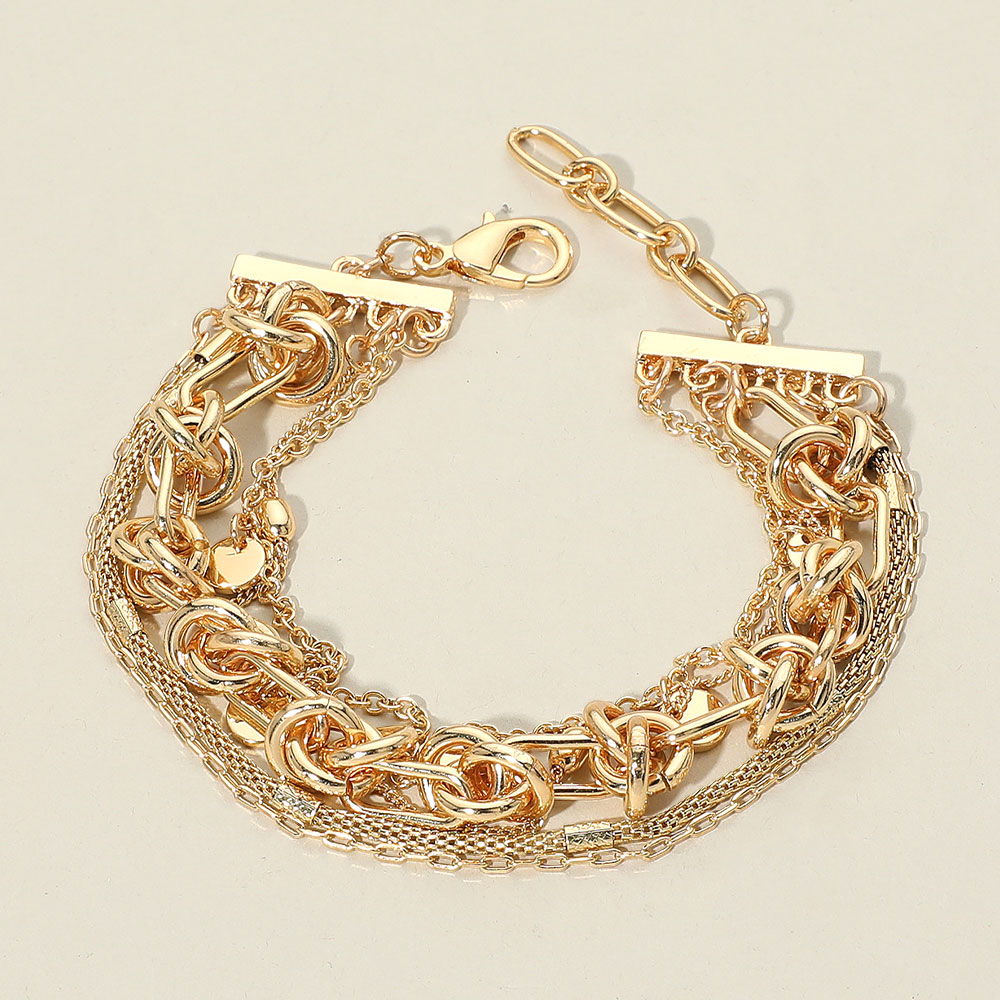 Details • Size : 1" H, 8" + 1.5" L • Lobster Clasp Closure • Elevate your look with this multi-strand chain bracelet featuring intricate knot details. A striking accessory that blends elegance with edge, perfect for both everyday wear and special occasions. Adjustable clasp ensures a secure and comfortable fit. • Lead and Nickel Compliant
