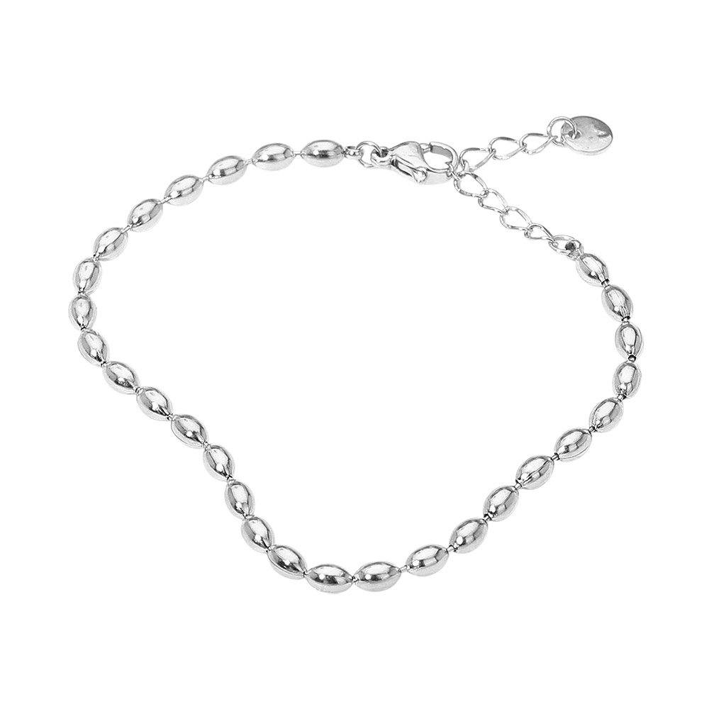 Details • Size : 0.2" H, 6.75" + 1.5" L • Lobster Clasp Closure • Water Resistant • This elegant beaded chain bracelet features a delicate series of polished oval beads linked together for a timeless look. Its lightweight and versatile style makes it perfect for layering or wearing solo, adding a touch of sophistication to both casual and refined outfits. • Stainless Steel