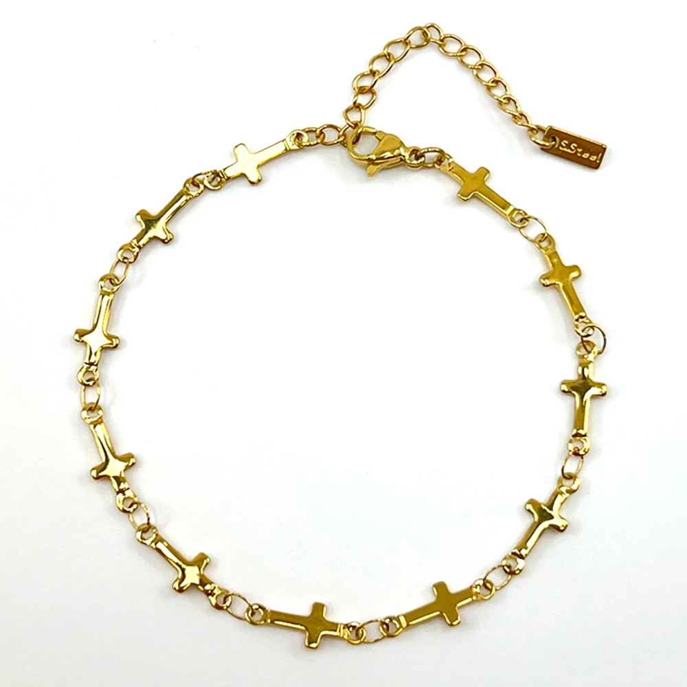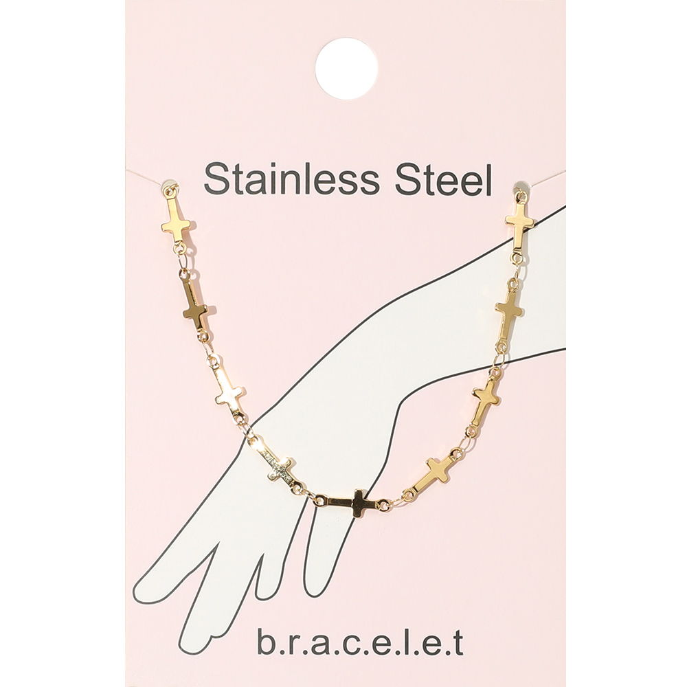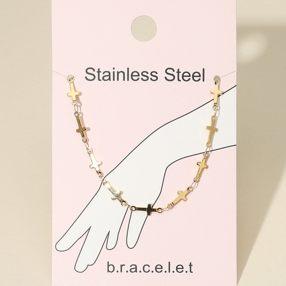 Details • Size : 0.25" H, 6.5" + 1.5" L • Lobster Clasp Closure • Delicate stainless steel bracelet with linked cross charms for a sleek and meaningful touch. Perfect for daily wear or gifting, this bracelet blends simplicity with subtle symbolism. • Stainless Steel