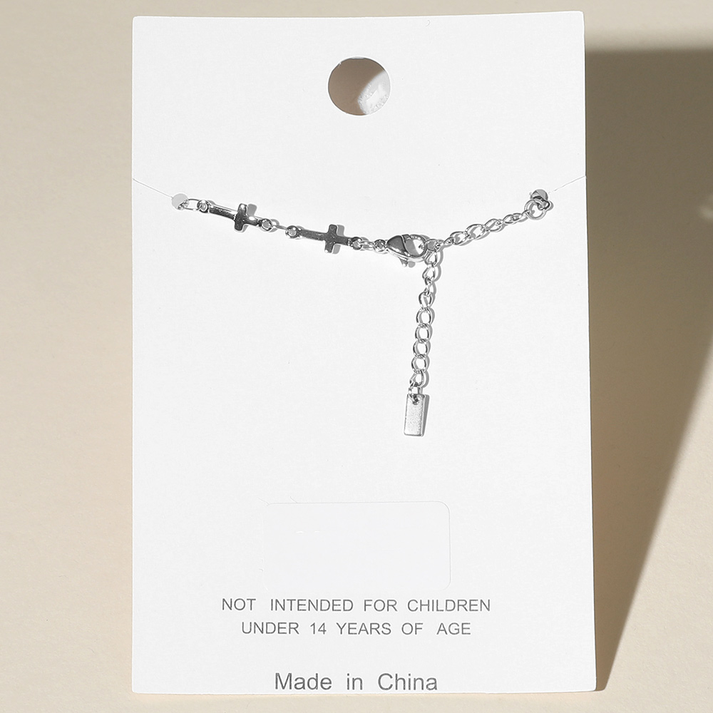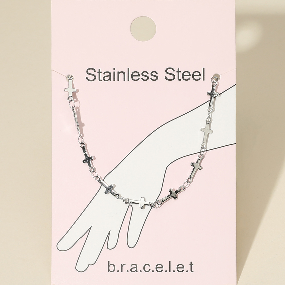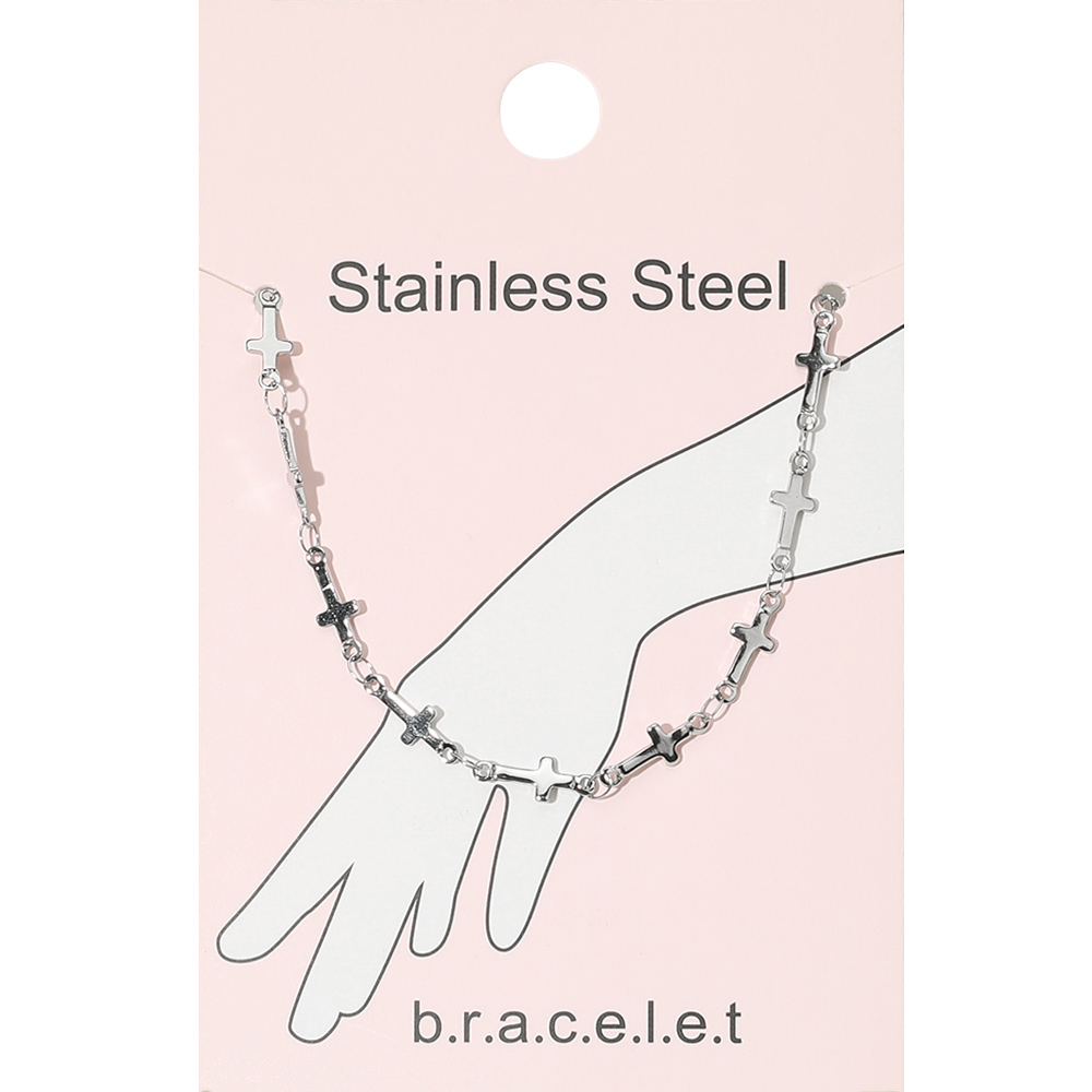 Details • Size : 0.25" H, 6.5" + 1.5" L • Lobster Clasp Closure • Delicate stainless steel bracelet with linked cross charms for a sleek and meaningful touch. Perfect for daily wear or gifting, this bracelet blends simplicity with subtle symbolism. • Stainless Steel