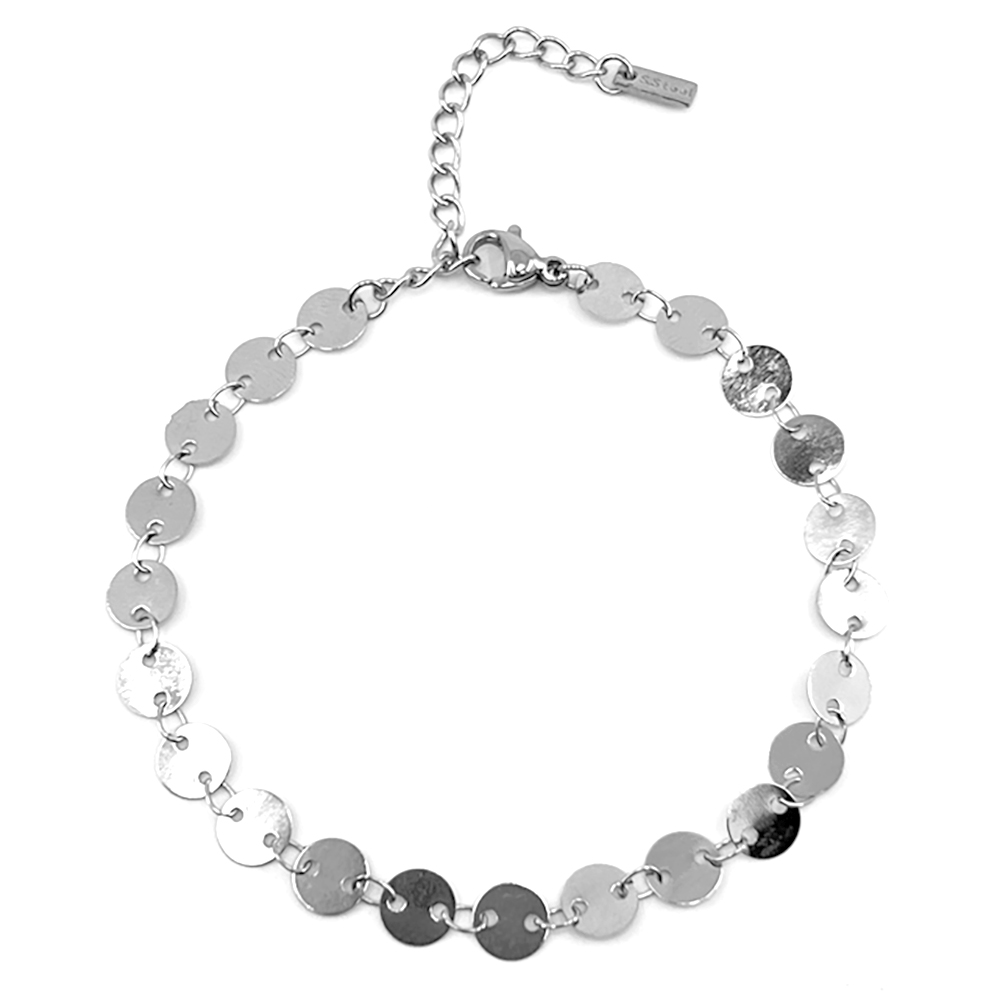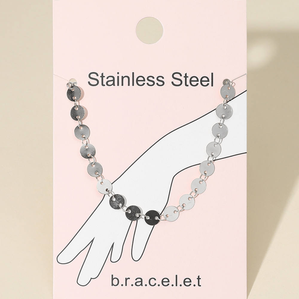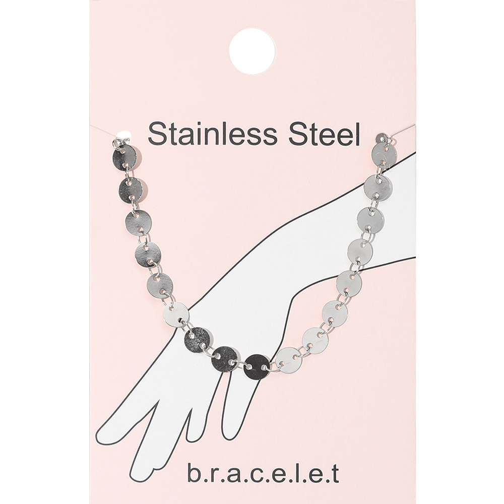• Modern bracelet featuring sleek flat disc links for a minimalist yet eye-catching look. Ideal for layering or wearing solo, this stainless steel design adds a polished accent to any outfit.
