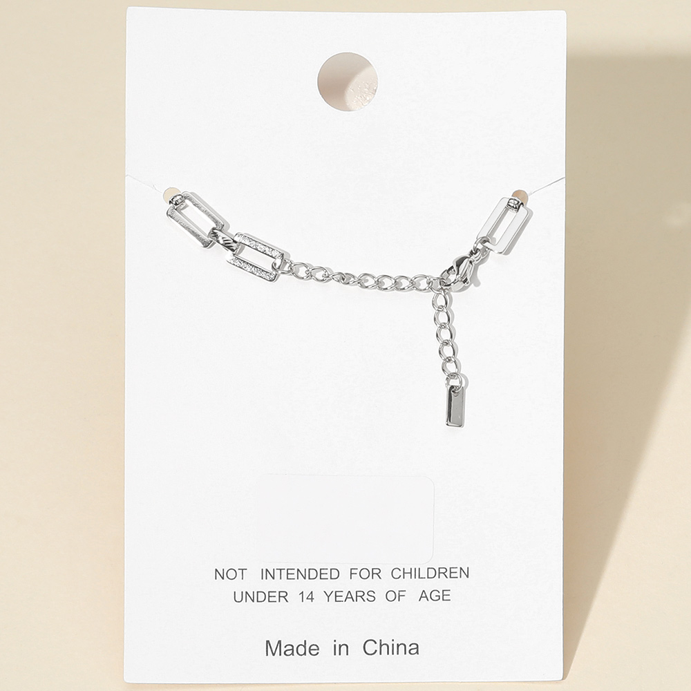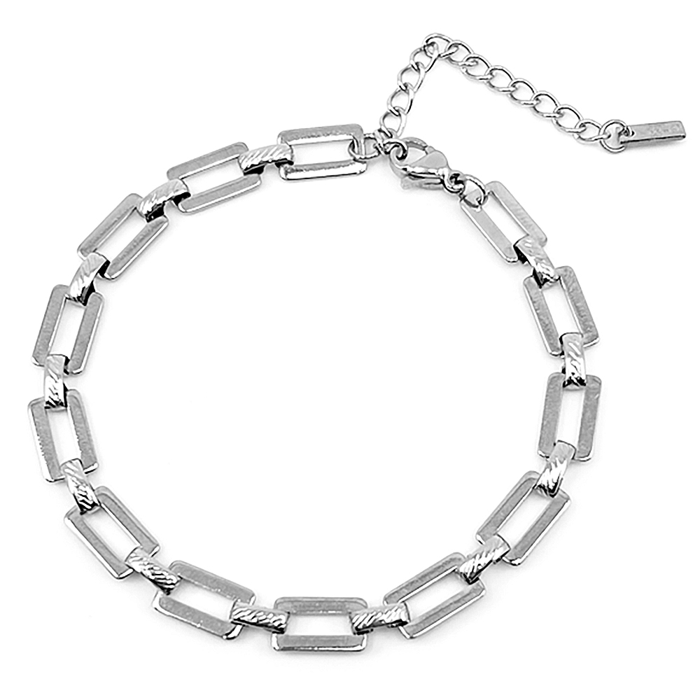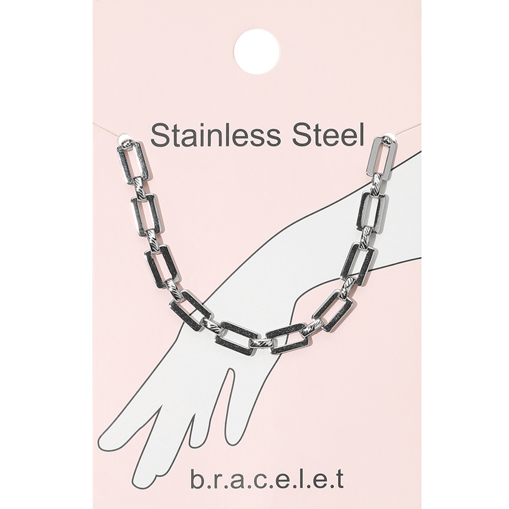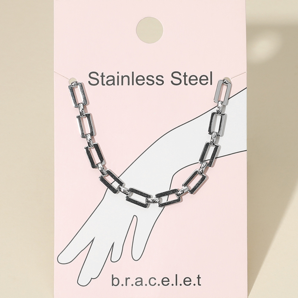 Details • Size : 0.25" H, 6.5" + 1.5" L • Lobster Clasp Closure • Modern stainless steel bracelet featuring open rectangular links in a sleek geometric design. Perfect for stacking or solo wear, it adds a bold touch to casual or dressy looks. • Stainless Steel