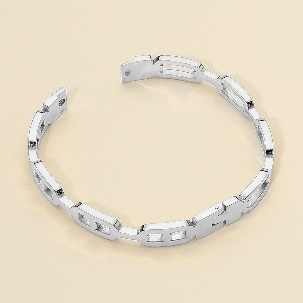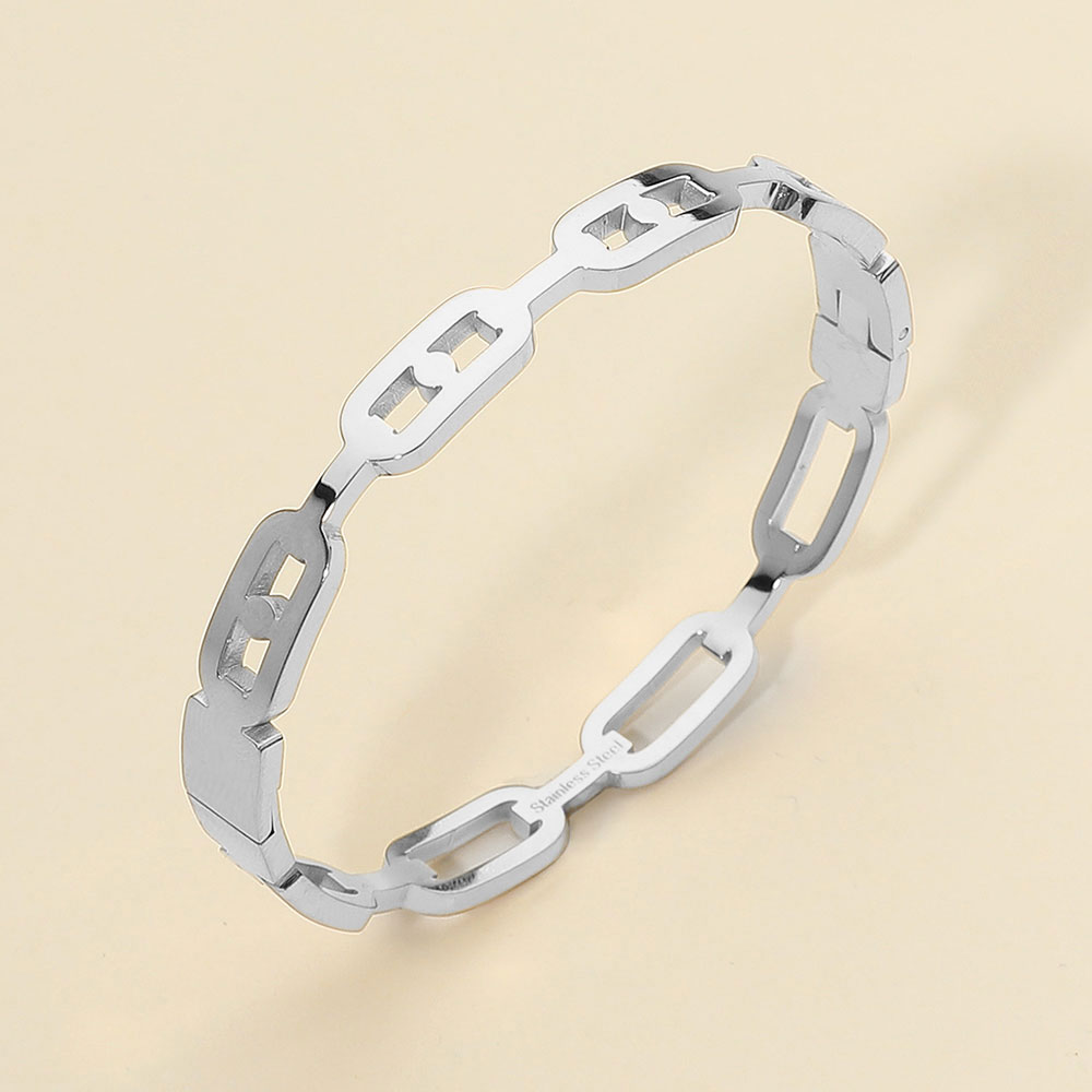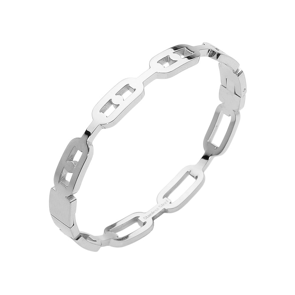 Details • Size : 0.25" H, 2.3" D • Hinged Closure • Minimalist hinged bracelet featuring open rectangular links for a sleek, modern silhouette. A lightweight, versatile accent for daily wear or layered styling. • Stainless Steel