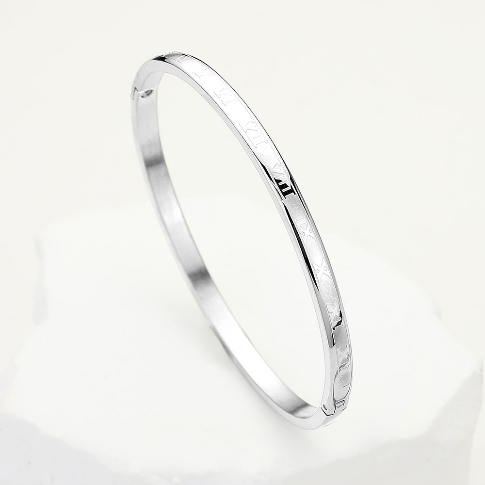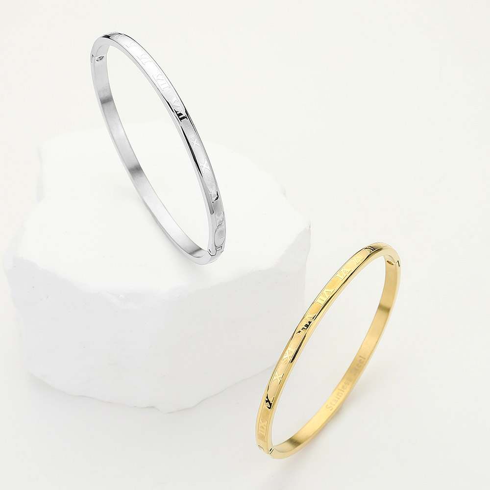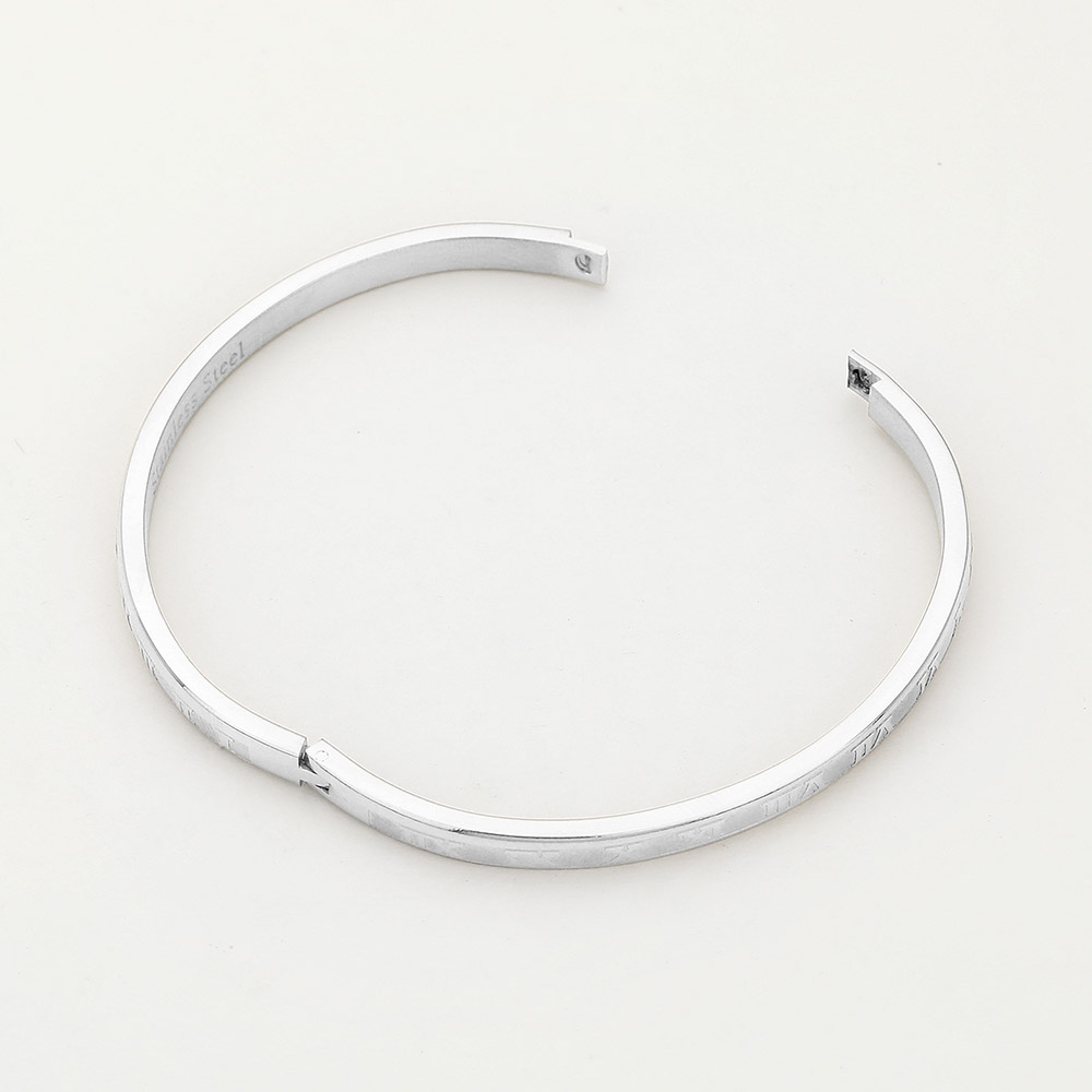 Details • Size : 0.2" H, 2.4" D • Hinged Closure • Minimalist stainless steel bangle featuring delicate engraved detailing for a refined finish. Its sleek, slim profile offers versatile styling, perfect for layering with other pieces or wearing alone for a subtle yet sophisticated accent to any look. • Stainless Steel