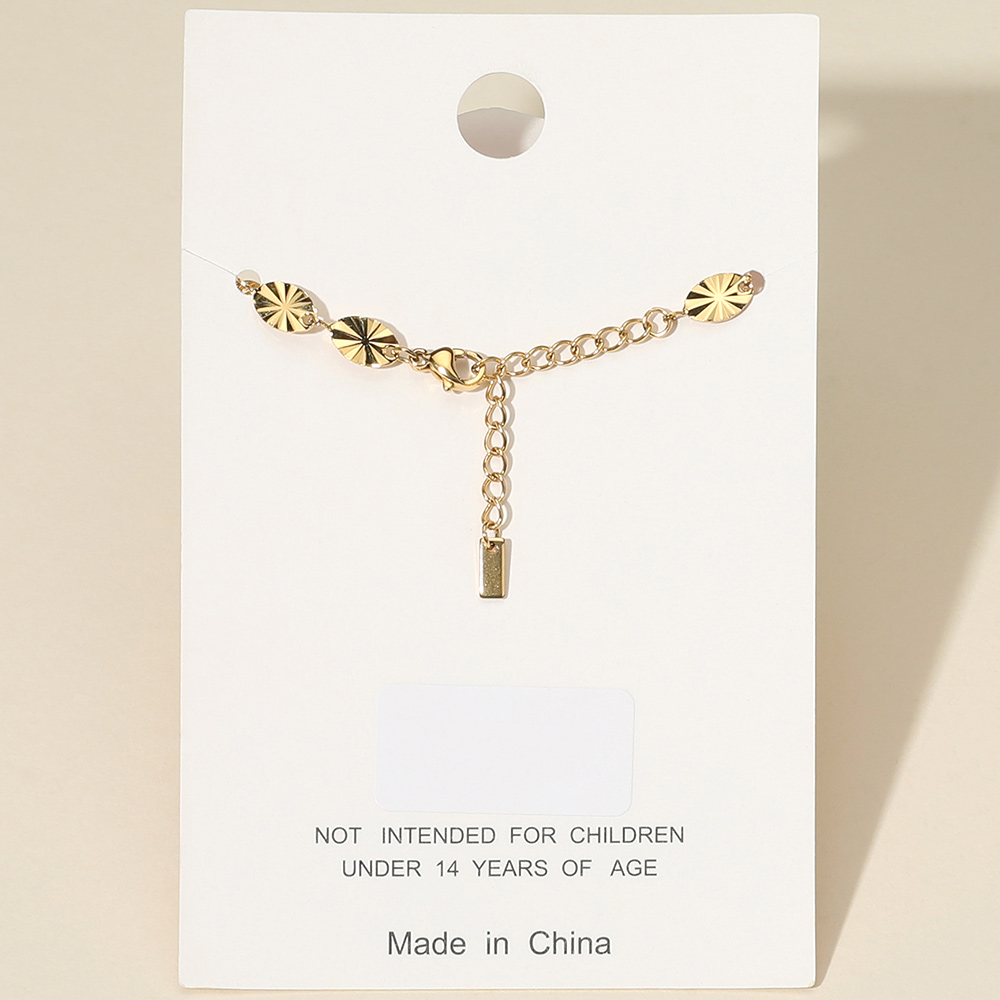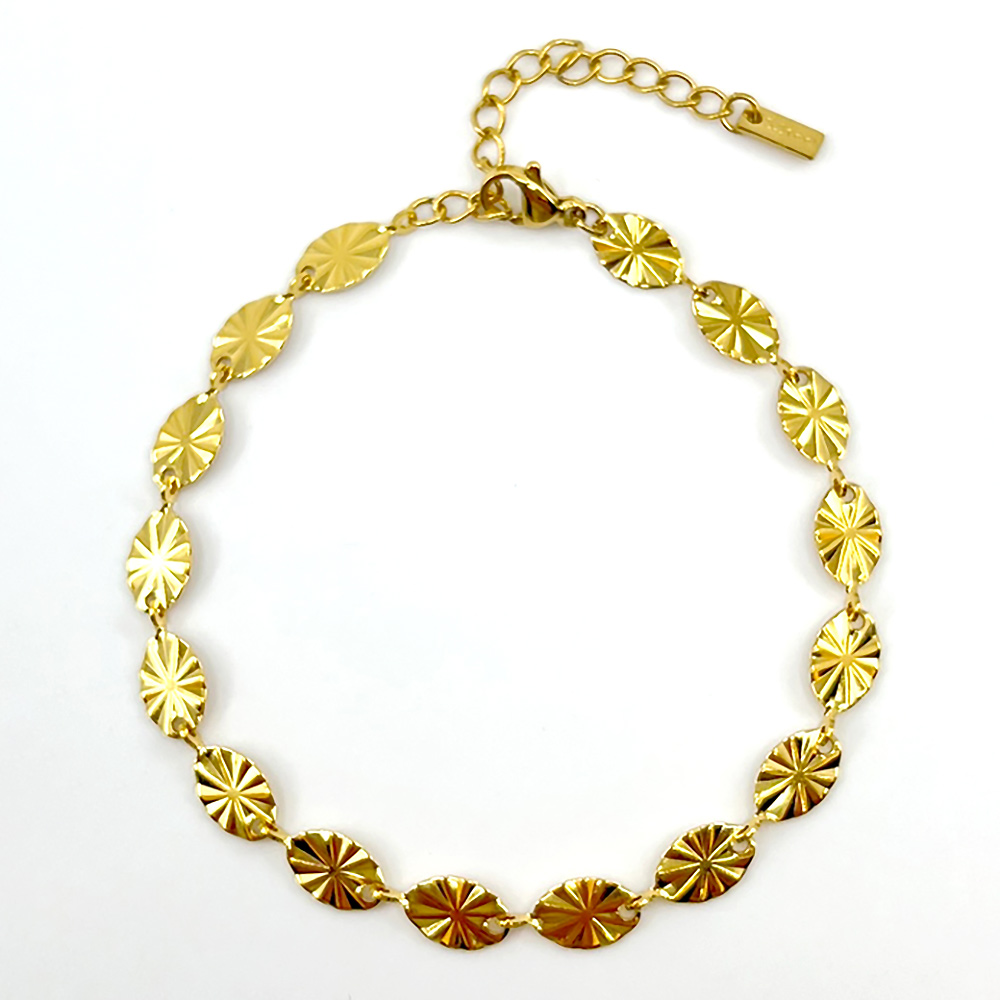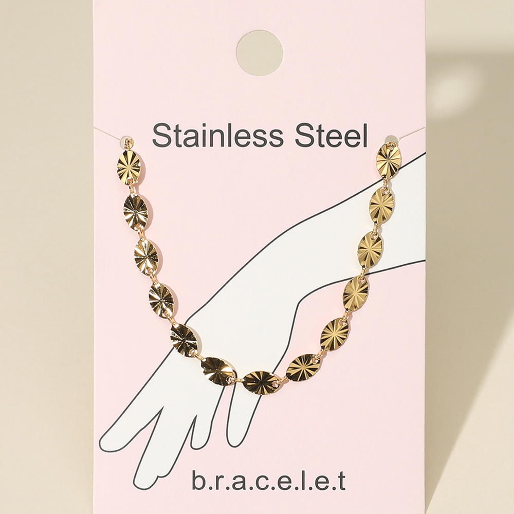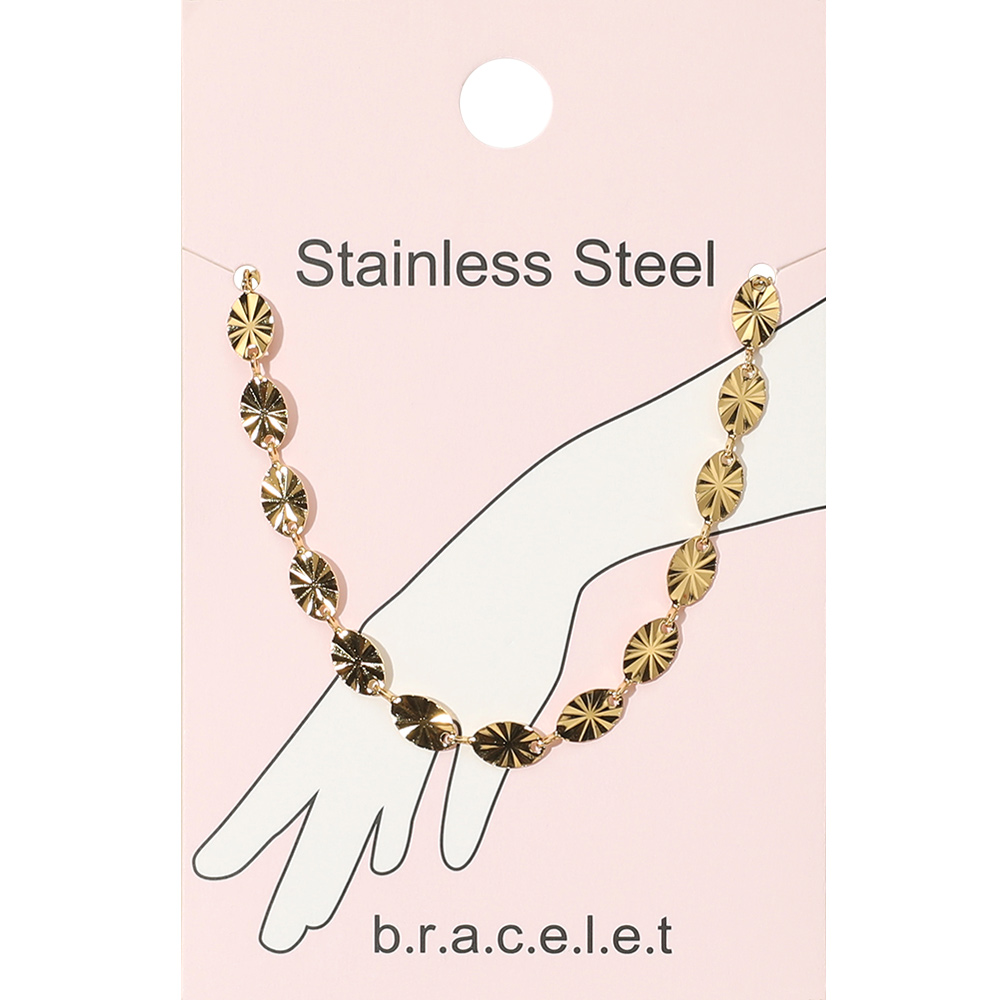 Details • Size : 0.25" H, 6.5" + 1.5" L • Lobster Clasp Closure • Shiny stainless steel bracelet with textured oval links for a radiant, eye-catching design. A stylish everyday accessory that adds elegance and dimension to any outfit or bracelet stack. • Stainless Steel