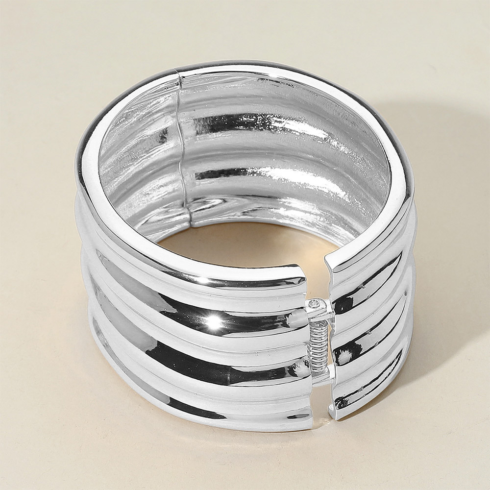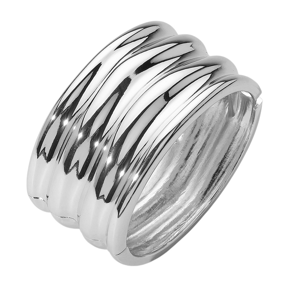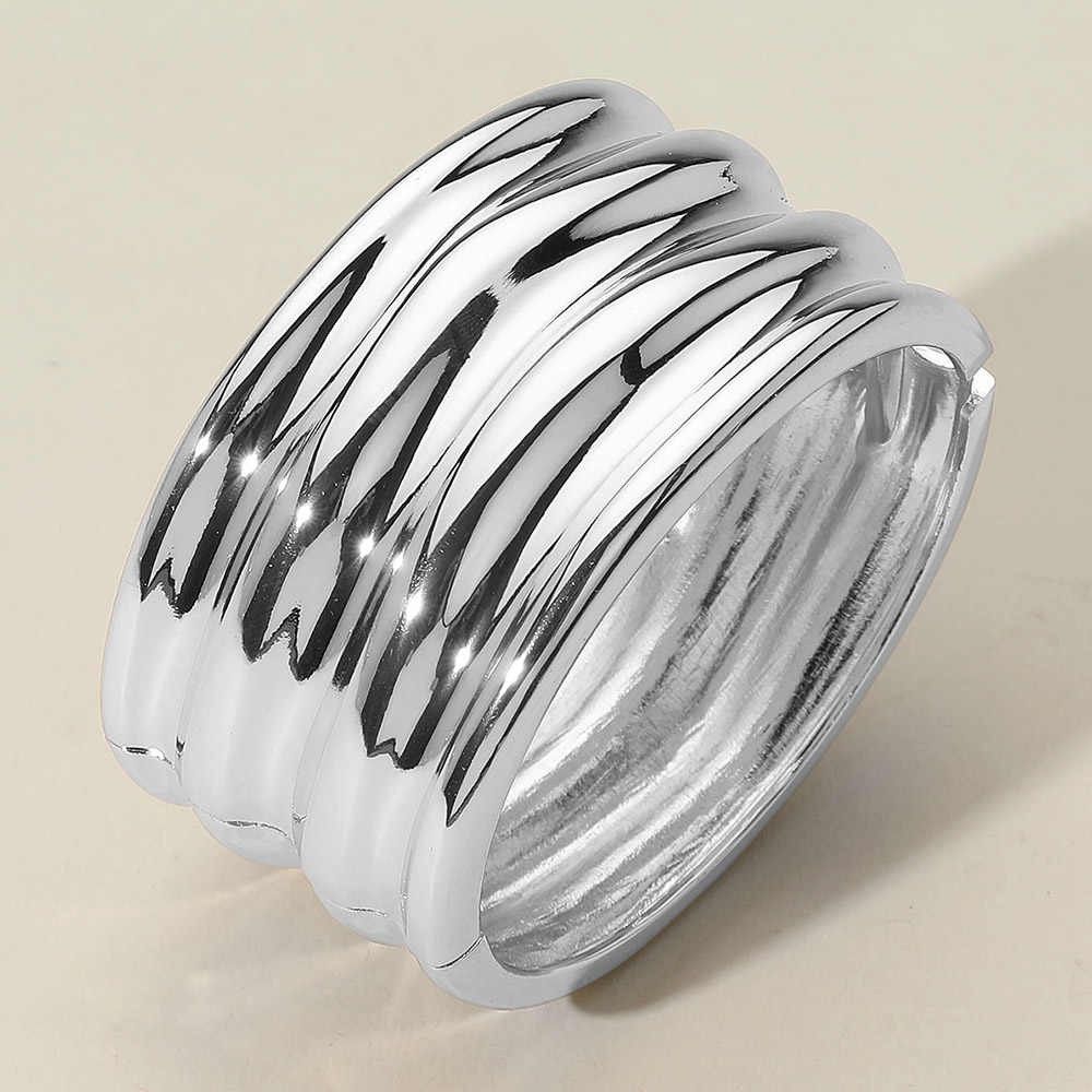 Details • Size : 1.5" H, 2.5" D • Hinged Closure • Make a modern statement with this ridged bangle bracelet, designed with a bold, sculptural silhouette and a sleek polished finish. Ideal for layering or wearing solo, it adds a touch of contemporary sophistication to everyday and elevated looks. • Lead and Nickel Compliant