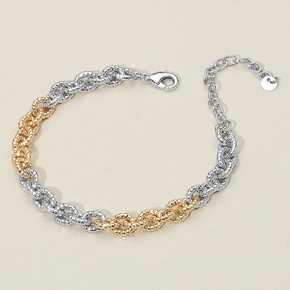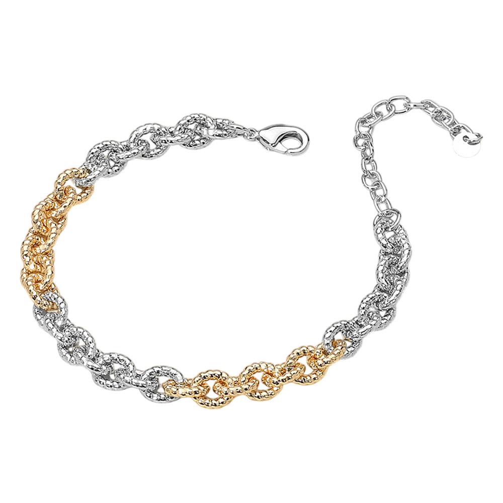 Details • Size : 0.3" H, 7.25" + 2.25" L • Lobster Clasp Closure • Textured rope chain bracelet featuring a mixed-tone finish and secure lobster clasp. A standout accessory with modern appeal, perfect for elevating your everyday or evening look. • Lead and Nickel Compliant • Brass