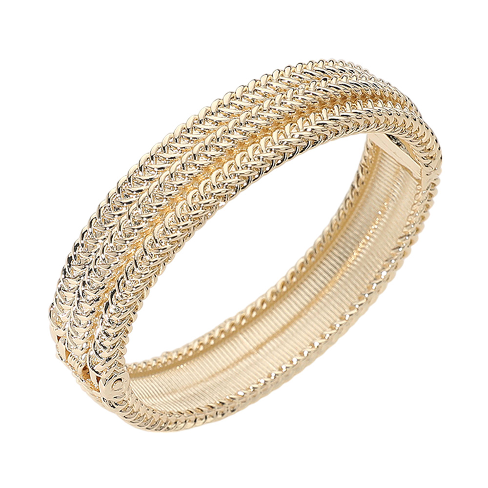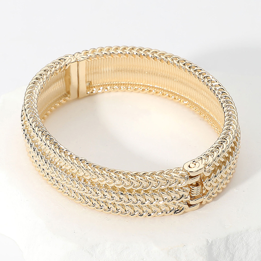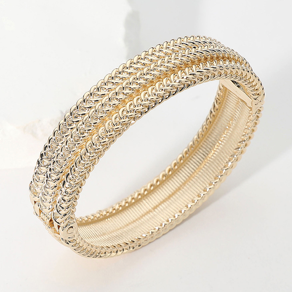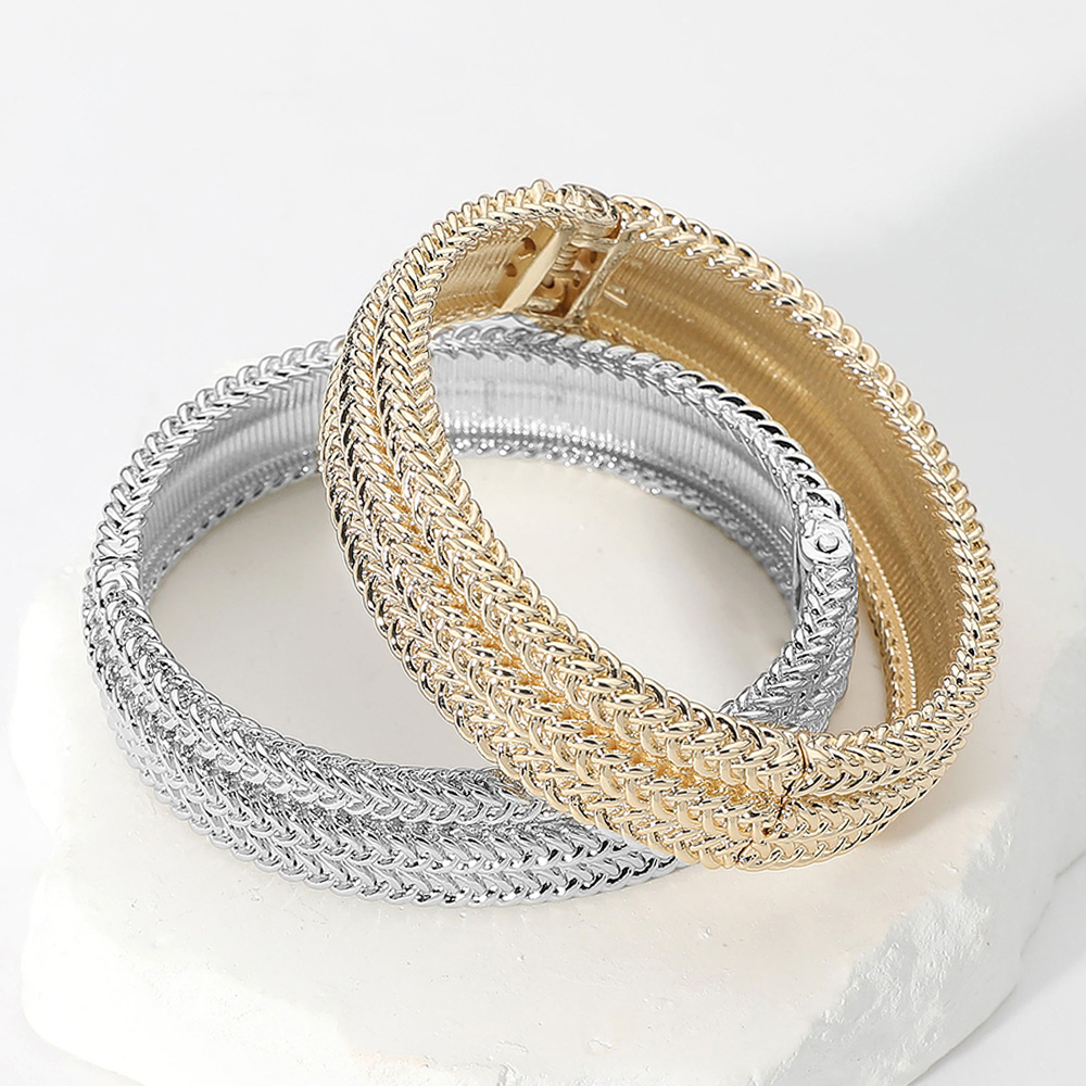 Details • Size : 0.6" H, 2.4" D • Hinged Closure • This textured mesh chain bangle bracelet offers a bold yet elegant design, blending intricate woven details with a sleek finish. A versatile piece that complements both casual and formal outfits, it adds depth and modern style to any look while ensuring comfort and timeless sophistication. • Lead and Nickel Compliant