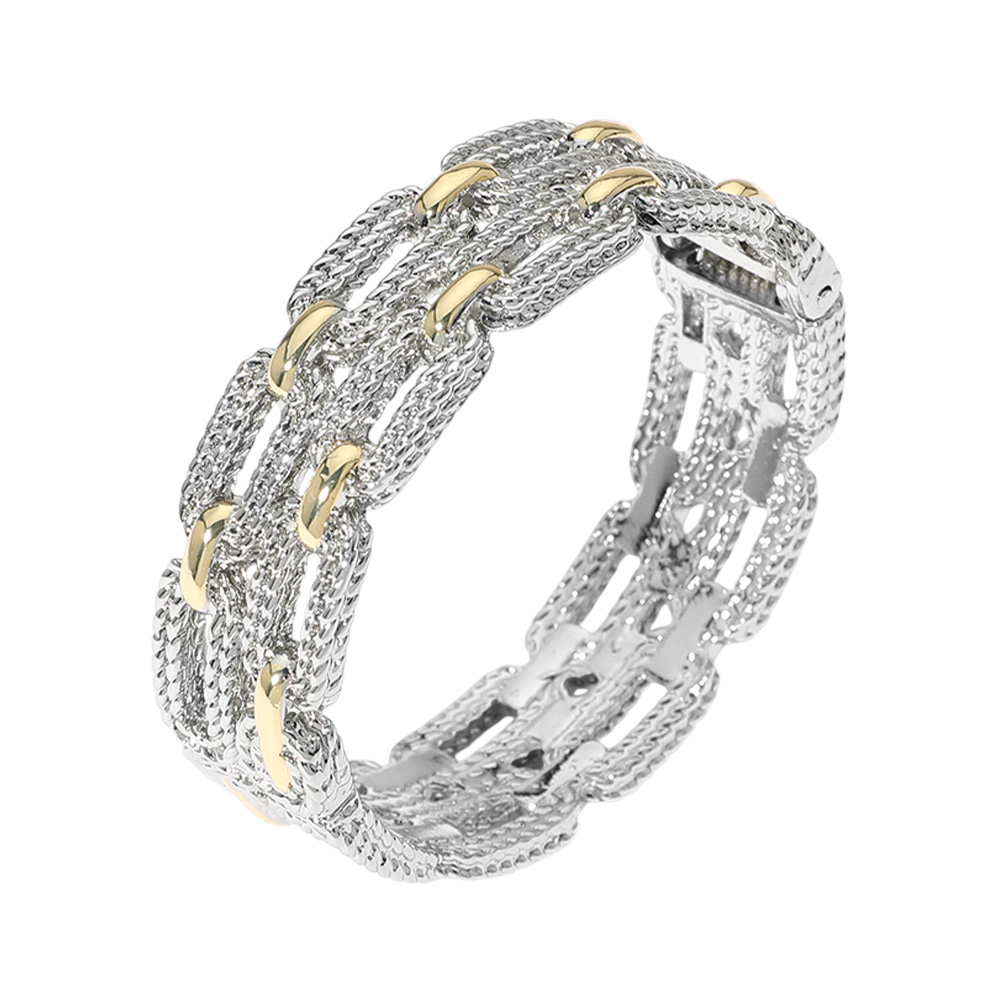 Details • Size : 0.75" H, 2.3" D • Hinged Closure • Bold and stylish, this textured link chain bangle bracelet features intricate woven details with a modern link design. Its unique craftsmanship creates a statement accessory that blends elegance with contemporary flair, making it the perfect bracelet for both everyday wear and special occasions.