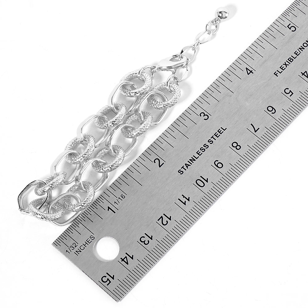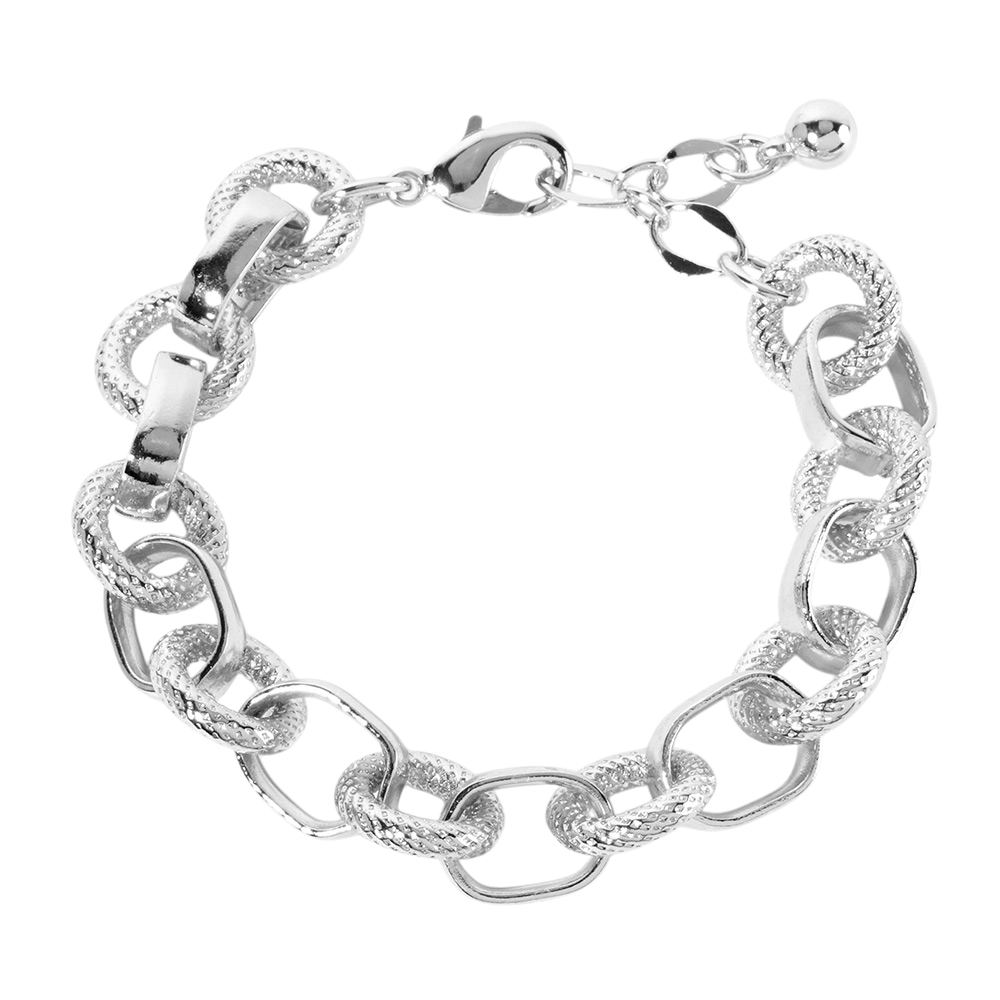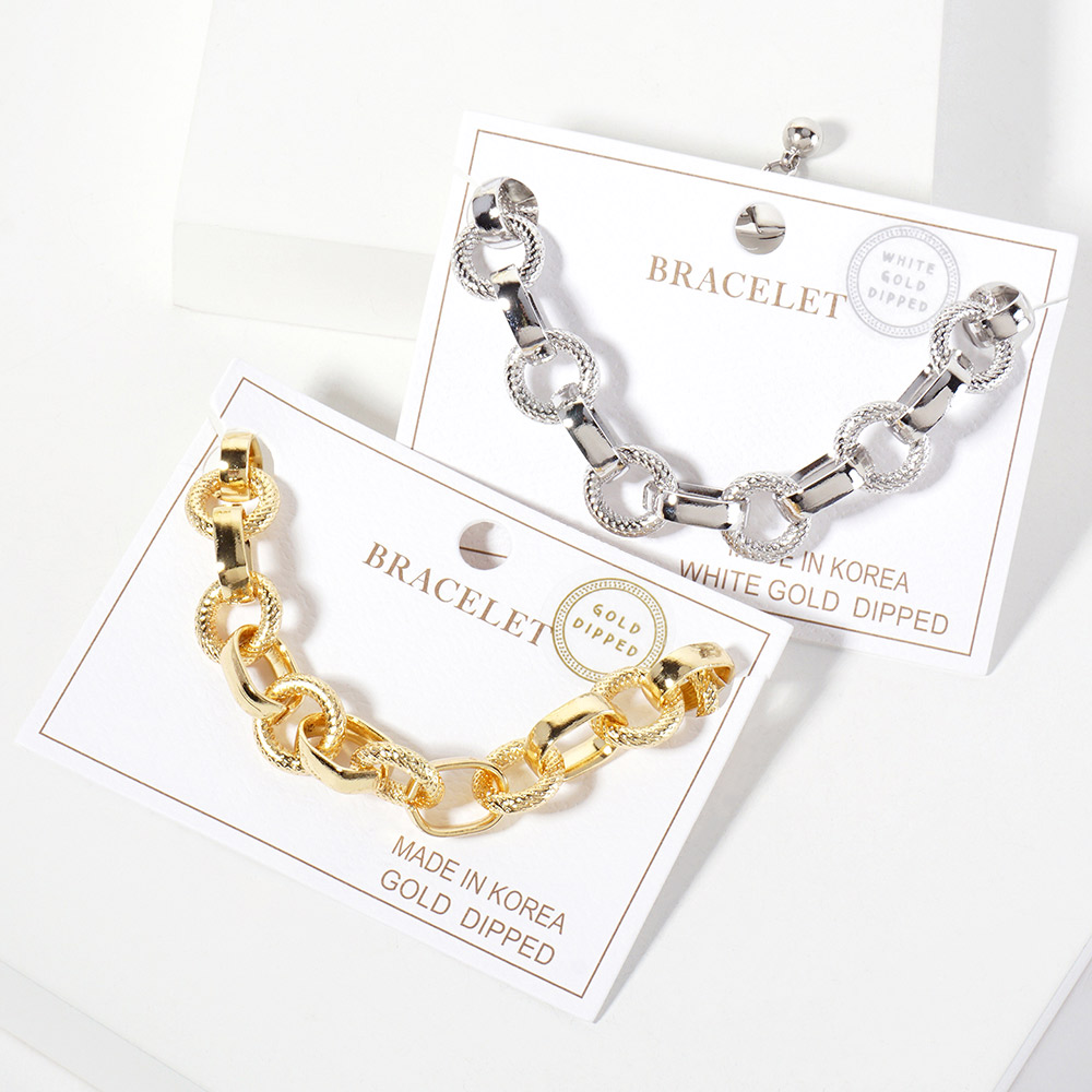 Details • Size : 0.4" H, 6.5" + 1.5" L • Lobster Clasp Closure • Make a striking impression with this bold interlocking link bracelet, crafted with a mix of smooth and textured finishes. Its elegant design adds dimension and style, making it a standout accessory for both casual and dressy occasions. Adjustable for a comfortable fit. • Lead and Nickel Compliant • Made In Korea • Gold Dipped