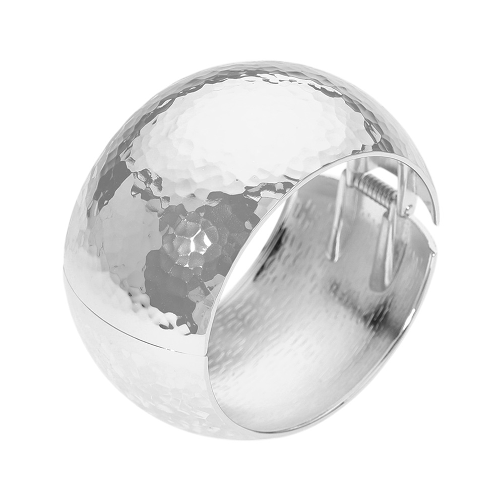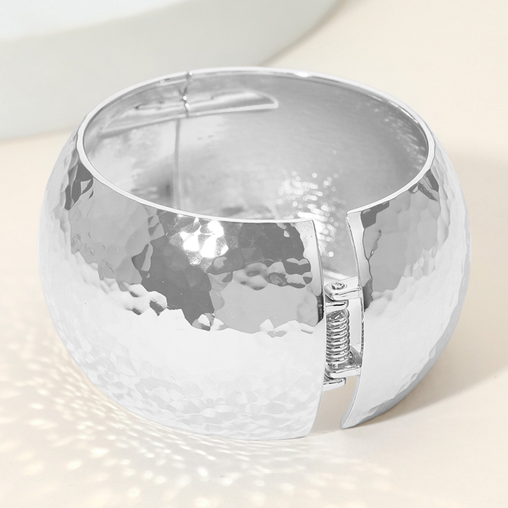 Details • Size : 1.75" H, 2.5" D • Hinged Closure • Make a bold statement with this domed hammered bangle bracelet. Its oversized rounded silhouette and gleaming textured finish deliver eye-catching style, while the hinged opening ensures easy wear. A standout accessory for effortlessly elevated looks. • Lead and Nickel Compliant