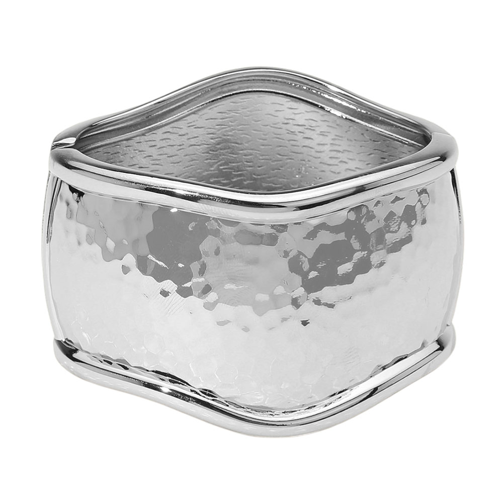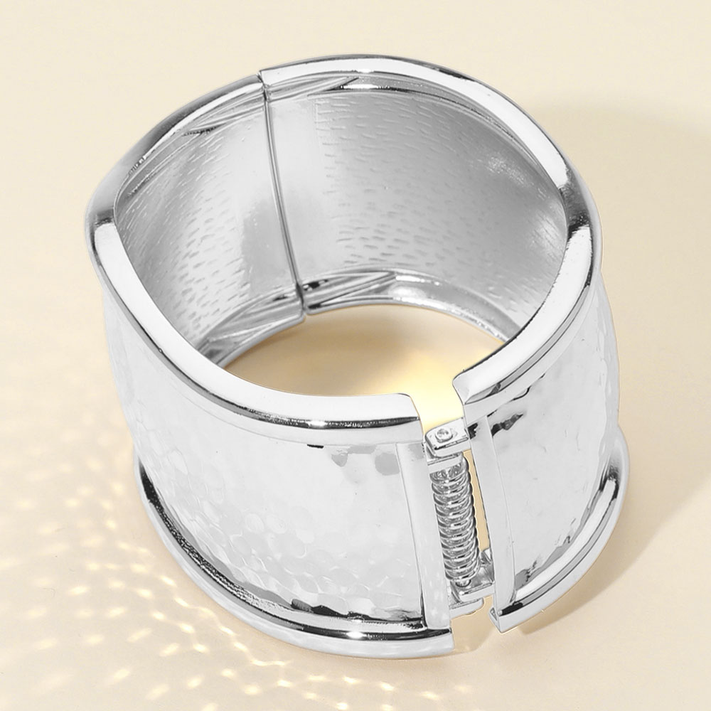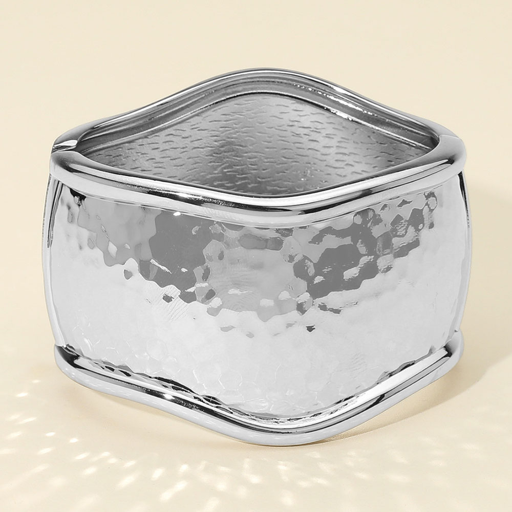Details • Size : 1.75" H, 2.5" D • Hinged Closure • Statement bangle bracelet with a hammered finish and sculpted wavy edges. Features a wide cuff design and a secure hinged closure for easy wear. A bold and elegant accessory to elevate your look. • Lead and Nickel Compliant