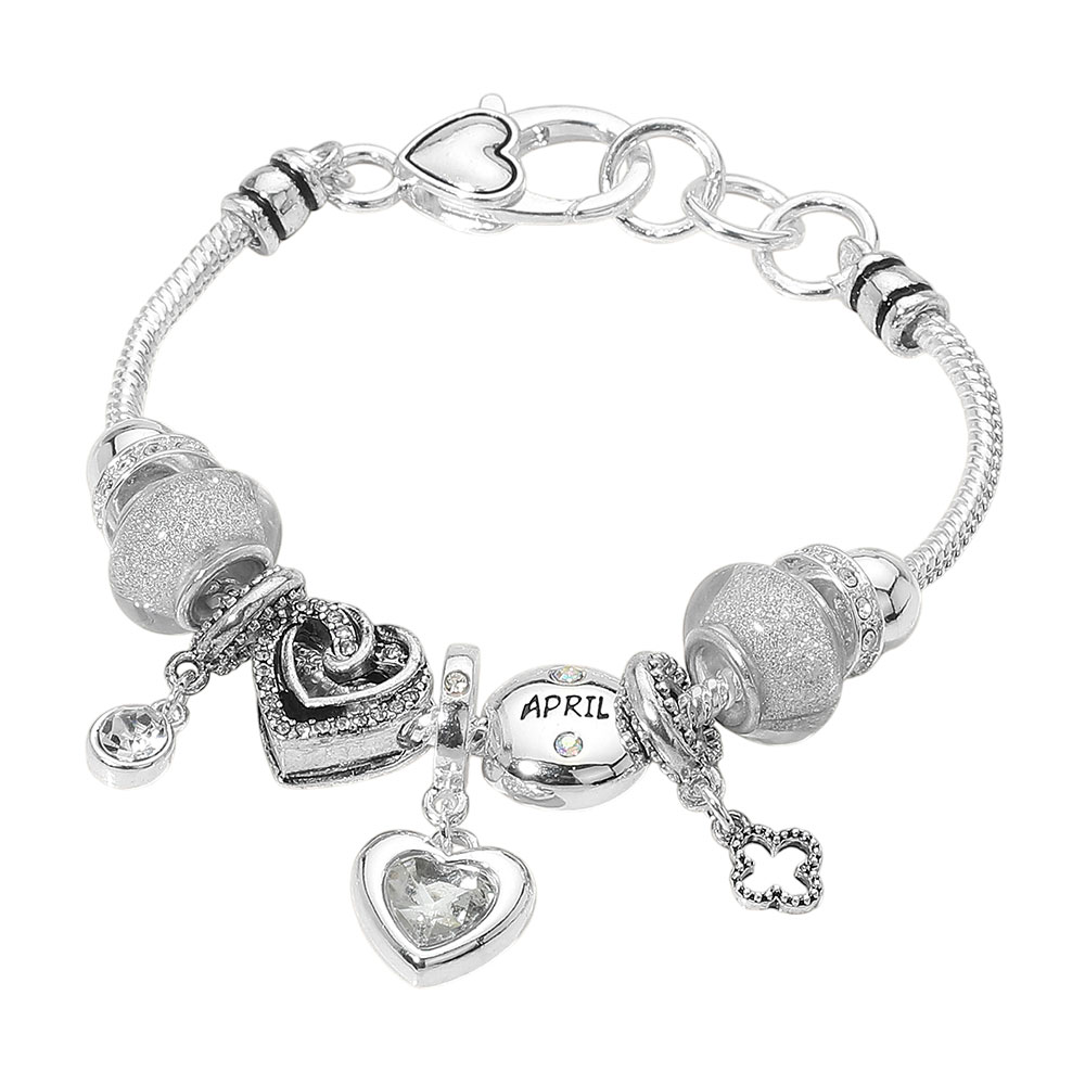 Details • Size : 0.25" H, 7" + 1" L • Charm Size : 1.1" L • Lobster Clasp Closure • Elegant April birthstone charm bracelet featuring heart-shaped details and shimmering crystal beads. Symbolizing innocence and love, this meaningful accessory makes a thoughtful gift or personal keepsake. • Lead and Nickel Compliant