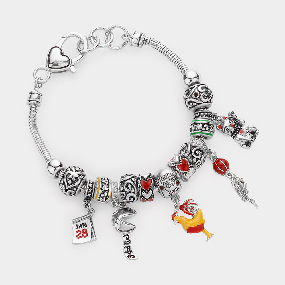 Details • Size : 1.5" H, 8" + 0.5" L • Lobster Clasp Closure • Celebrate meaningful moments with this charm bracelet featuring a mix of heart, calendar, and lucky symbol dangles. A detailed and expressive accessory perfect for everyday wear or as a thoughtful gift. • Lead and Nickel Compliant