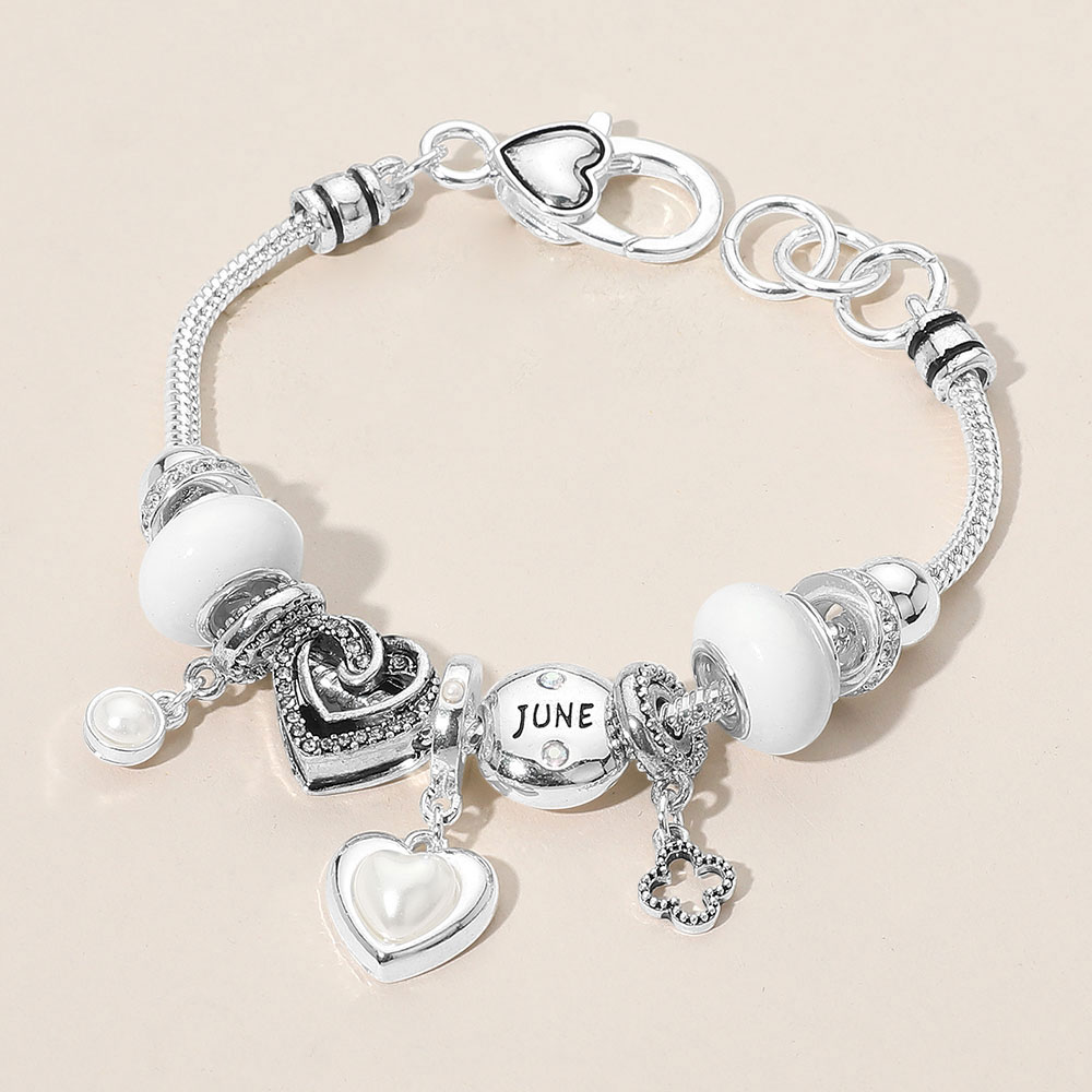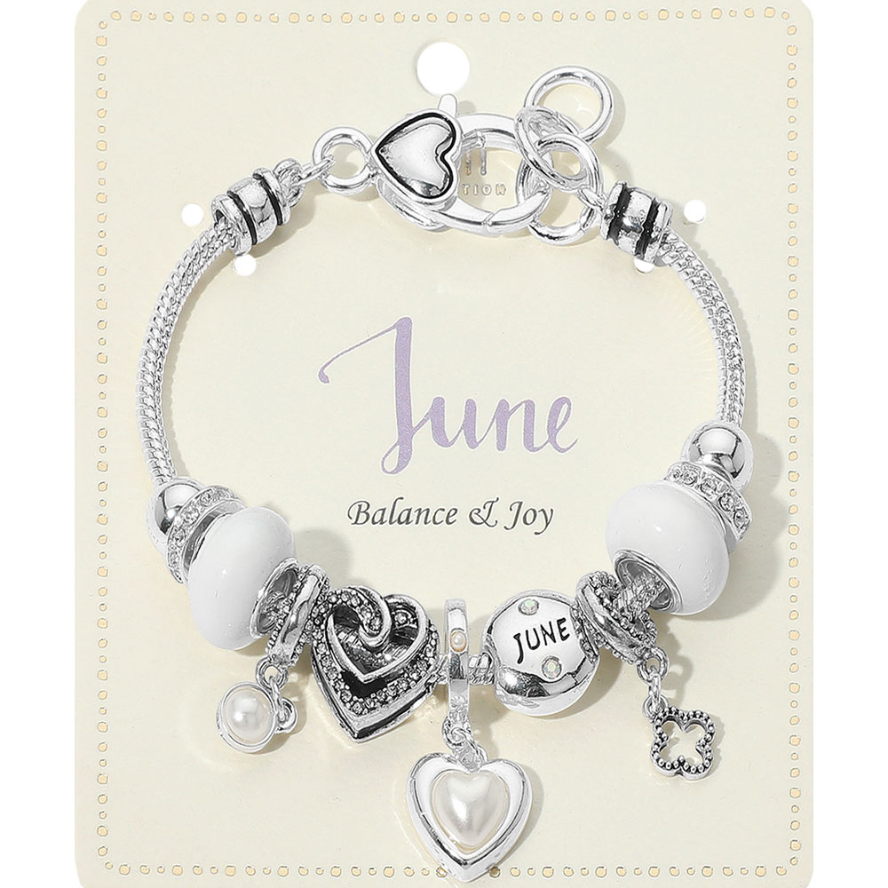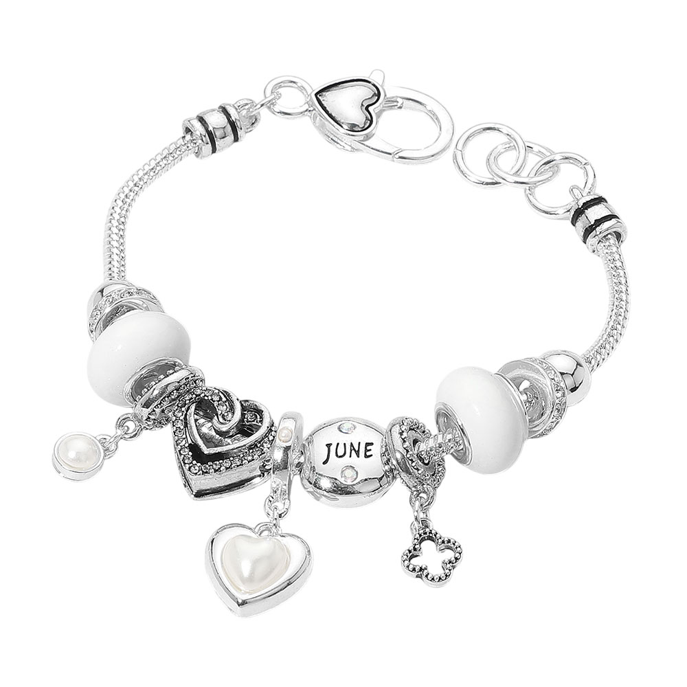 Details • Size : 0.25" H, 7" + 1" L • Charm Size : 1.1" L • Lobster Clasp Closure • Honor June birthdays with this elegant charm bracelet, adorned with heart and bead charms. Representing balance and joy, it's a thoughtful accessory or gift to celebrate the beauty of the birth month. • Lead and Nickel Compliant