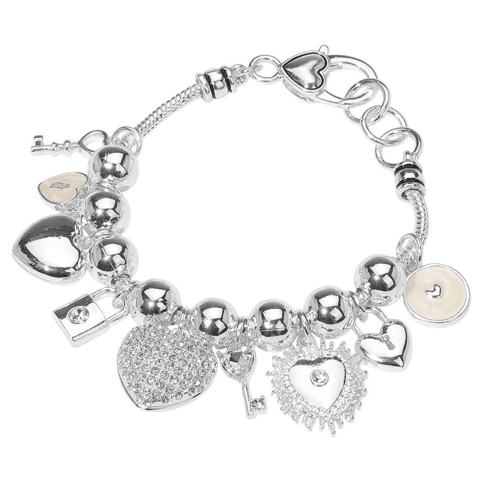 Details • Size : 1" H, 7" + 1" L • Lobster Clasp Closure • Stylish charm bracelet featuring a mix of heart, key, and lock charms with polished beads. Adds a touch of sparkle and sentiment to any outfit, making it a perfect gift or fashion statement piece. • Lead and Nickel Compliant