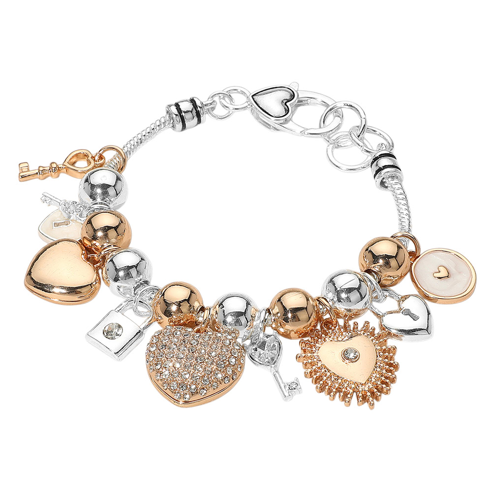 Details • Size : 1" H, 7" + 1" L • Lobster Clasp Closure • Stylish charm bracelet featuring a mix of heart, key, and lock charms with polished beads. Adds a touch of sparkle and sentiment to any outfit, making it a perfect gift or fashion statement piece. • Lead and Nickel Compliant