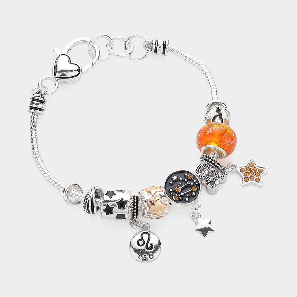 Details • Size : 1" H, 7" + 1" L • July 23 - August 22 • Lobster Clasp Closure • Show your generous and warm-hearted Leo nature with this zodiac charm bracelet. Featuring detailed astrology symbols and star accents, this accessory adds a personal and meaningful touch to any outfit. • Lead and Nickel Compliant