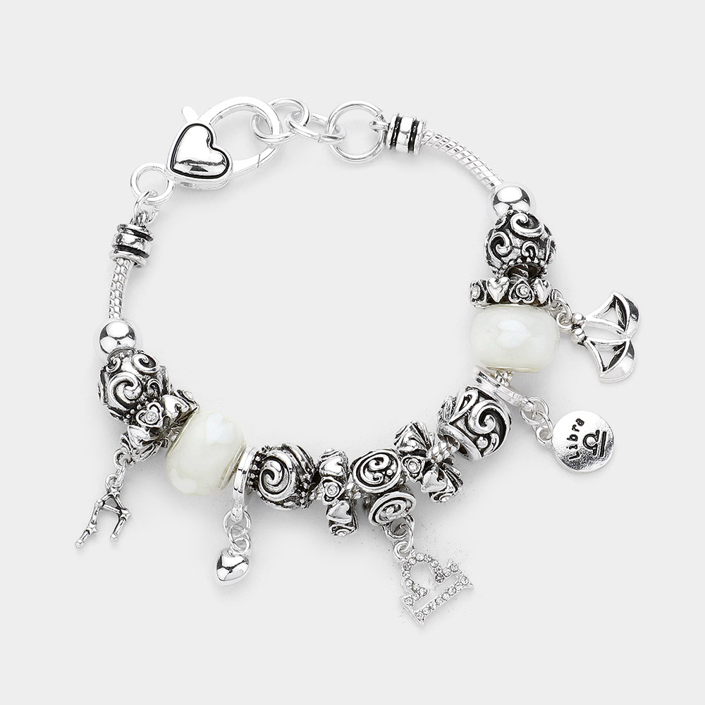 Details • Size : 1" H, 7" + 1" L • September 24 - October 23 • Lobster Clasp Closure • Embrace the charm of Libra with this zodiac bracelet, showcasing themed charms and intricate detailing. A perfect symbol of balance, romance, and charm, it makes a thoughtful gift or stylish accessory. • Lead and Nickel Compliant