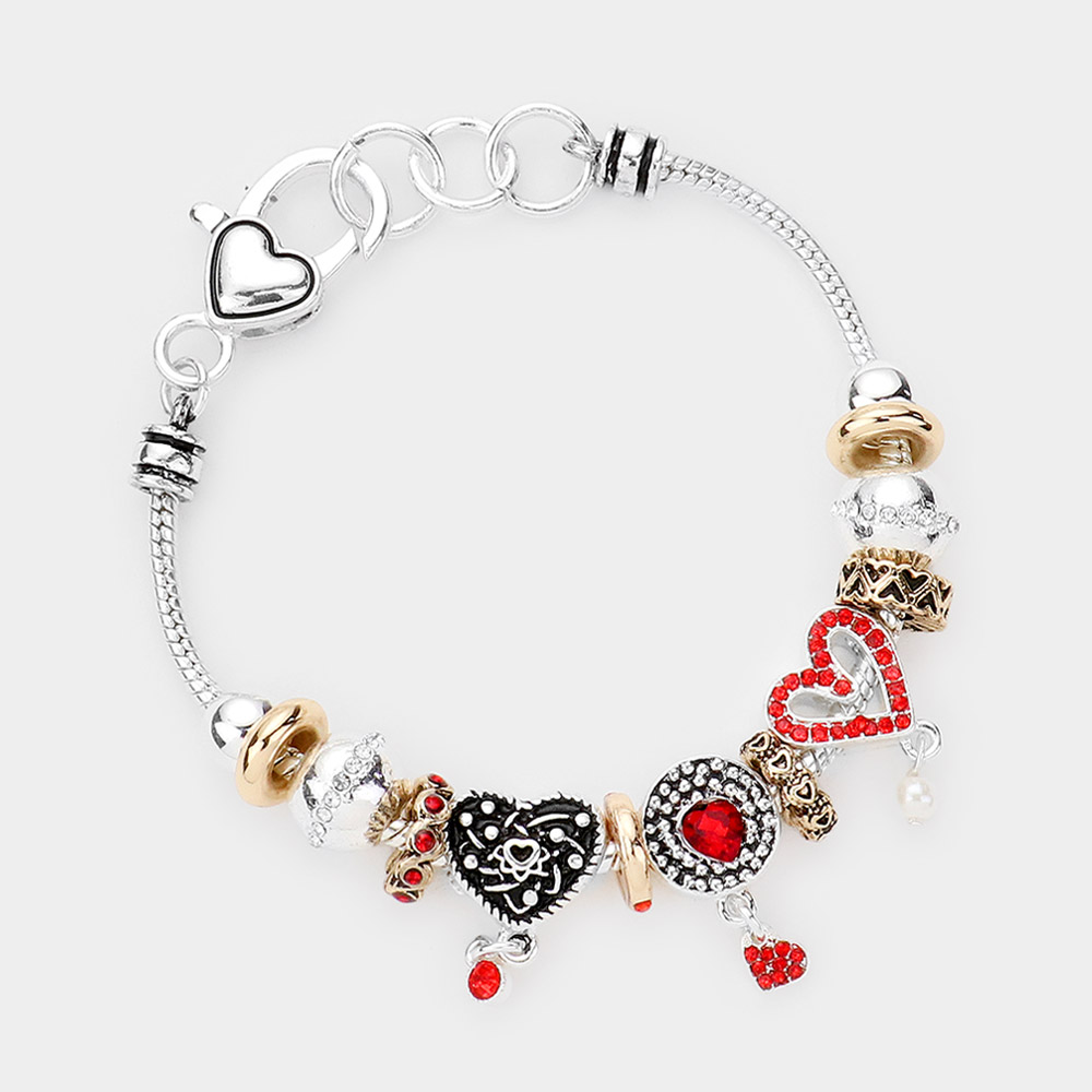 Details • Size : 0.85" H, 7" + 1" L • Lobster Clasp Closure • Elegant charm bracelet adorned with intricate heart-shaped pendants and detailed beadwork. A romantic accessory that adds a touch of whimsy and charm to any outfit, perfect for special occasions or daily wear. • Lead and Nickel Compliant