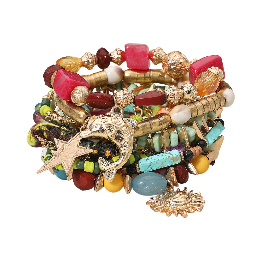 Details • Size 1 : 2" H / Stretchable • Size 2 : 0.4" H, 7" + 2" L / Lobster Clasp Closure • Boho dolphin star sun charm bracelet set featuring layered beaded strands with bold shapes, textured accents, and playful ocean-inspired motifs including a dolphin, star, and sun. Designed for stacking and stylish everyday wear, adding a vibrant artisan touch to casual outfits, festivals, vacations, and gifting occasions. • Lead and Nickel Compliant • Made In India
