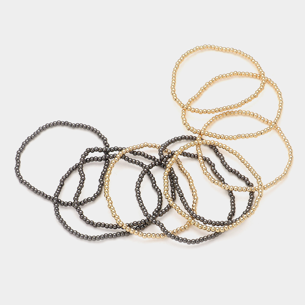 Details • Size : 1.5" H • Stretchable • Elevate your style with this 10-piece beaded bracelet set featuring a striking contrast of bright and dark metallic tones. Designed for effortless stacking, each stretch bracelet offers flexible comfort and bold visual texture. • Lead and Nickel Compliant