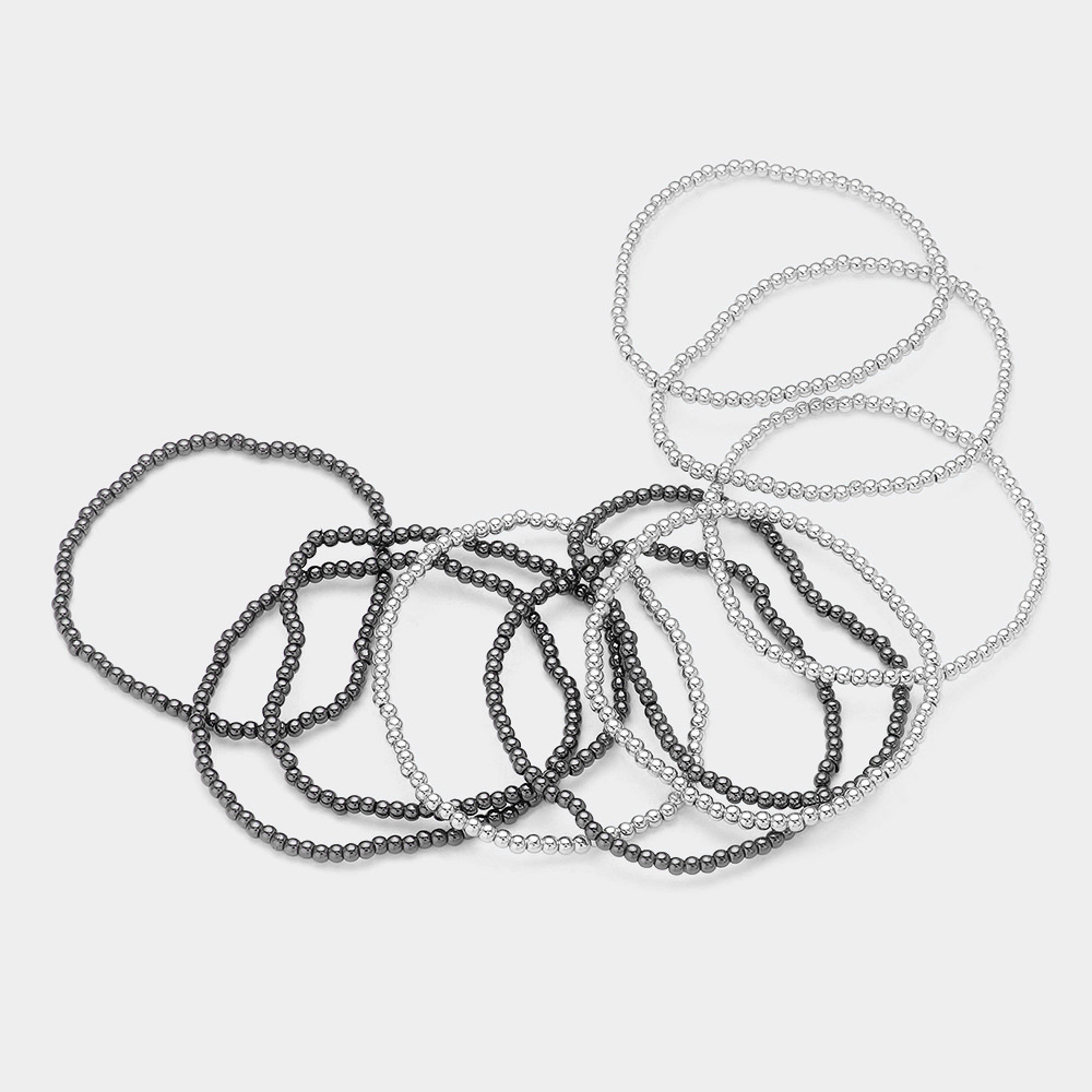 • Elevate your style with this 10-piece beaded bracelet set featuring a striking contrast of bright and dark metallic tones. Designed for effortless stacking, each stretch bracelet offers flexible comfort and bold visual texture.