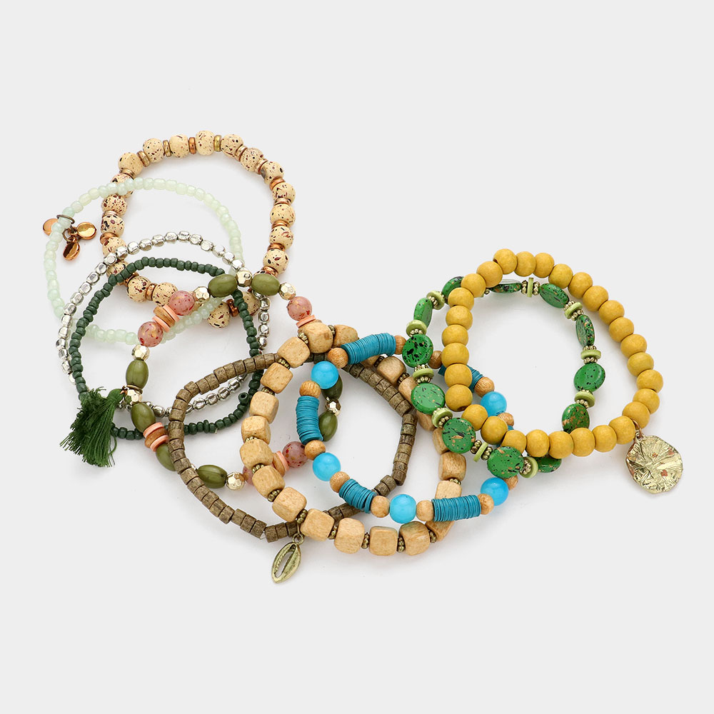 10PCS - Metal Puka Shell Tassel Charm Wood Heishi Beaded Stretch Bracelets
