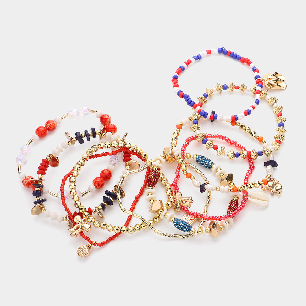 10PCS - Puka Shell Metal Bow Elephant Charm Pointed Various Beads Beaded Stretch Multi Layered Bracelet
