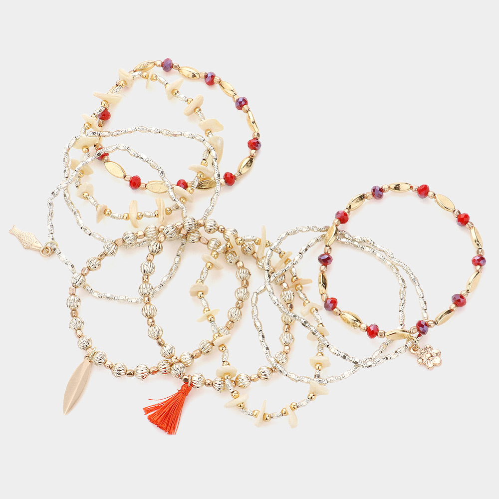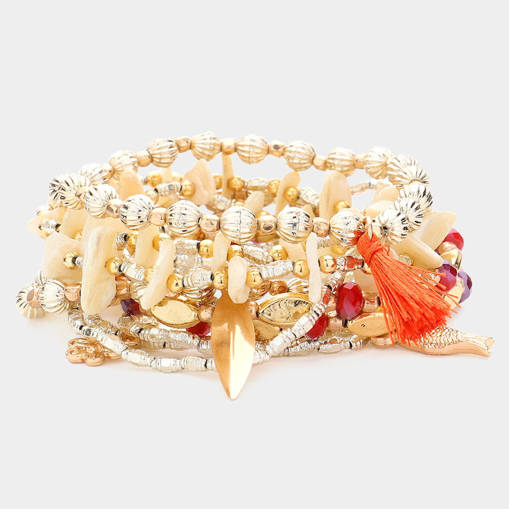 10PCS - Swirl Metal Disc Tassel Charm Mother Of Pearl Beaded Fish Flower Charms Stretch Multi Layered Bracelets